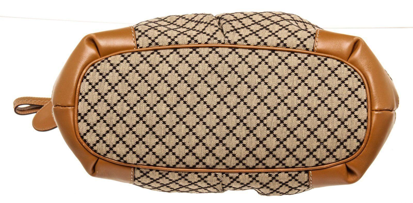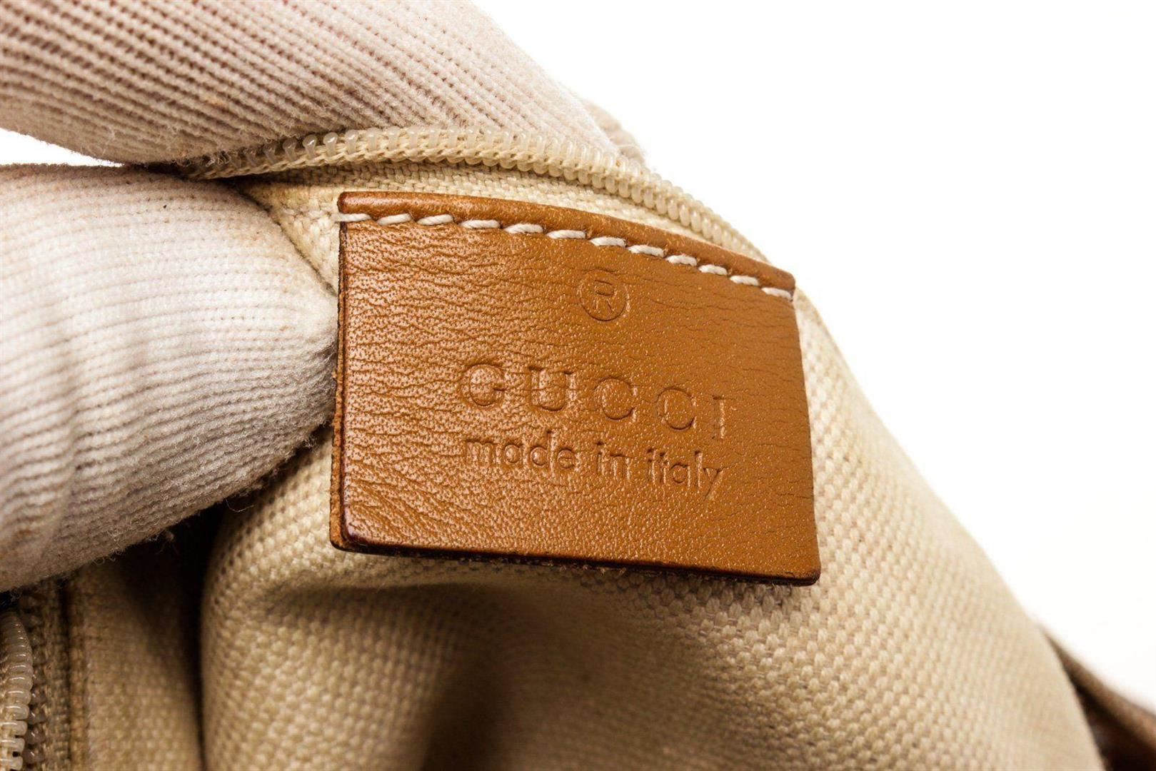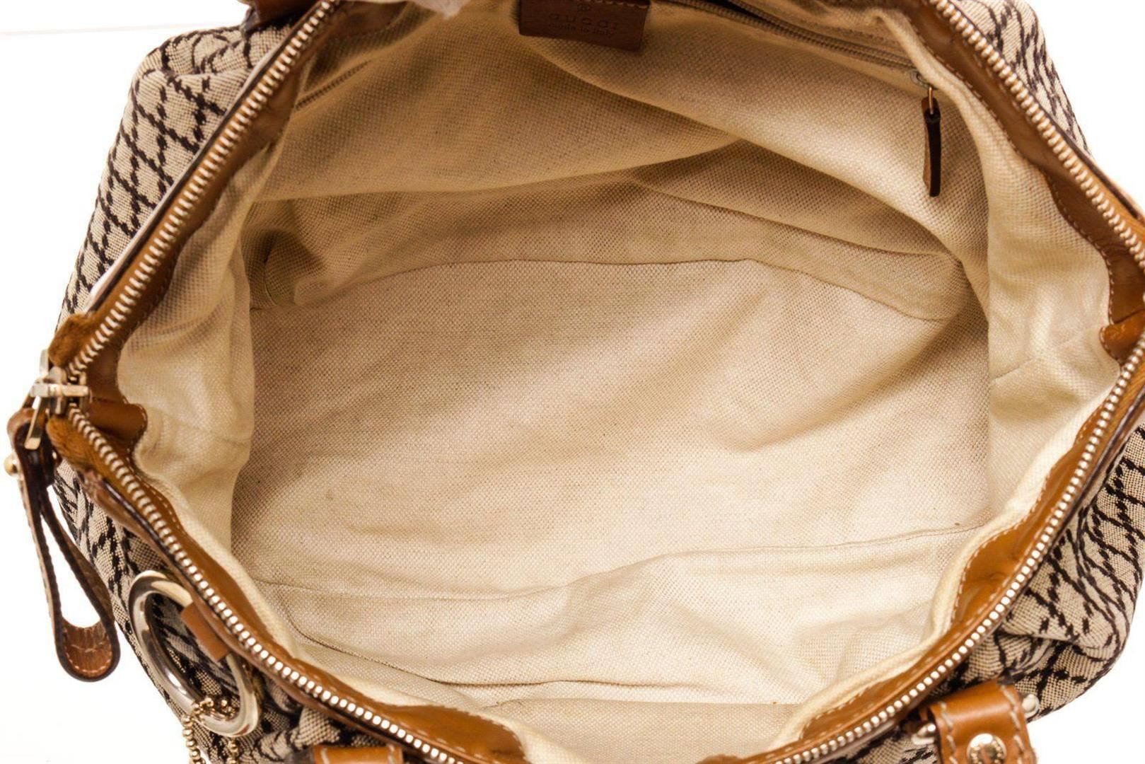 Gucci Brown Canvas Leather Sukey Tote Bag with canvas leather gold-tone hardware, black leather trim, dual-rolled handles, detachable adjustable shoulder strap, creme canvas lining, three interior pockets; one with zip closure and zip closure at top.