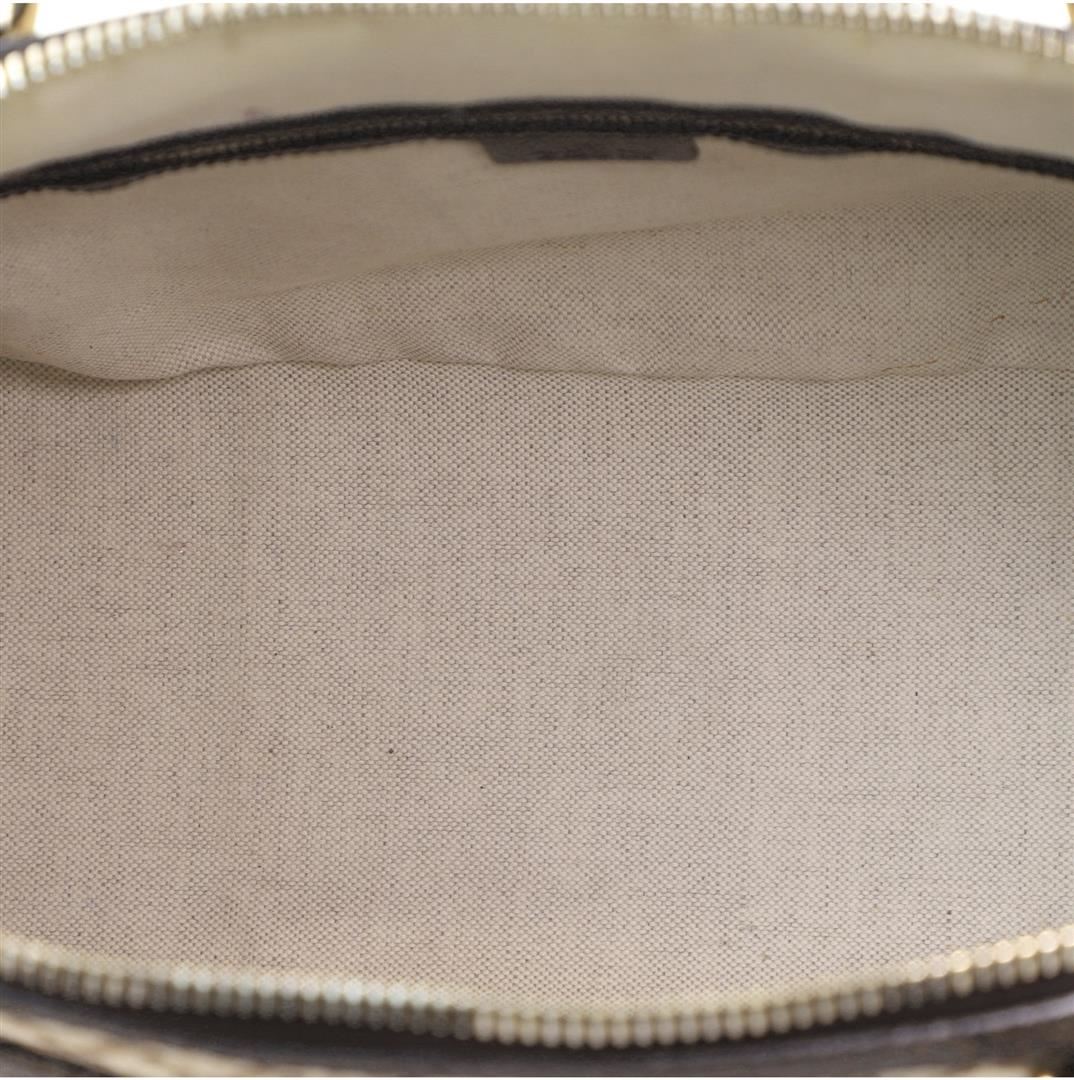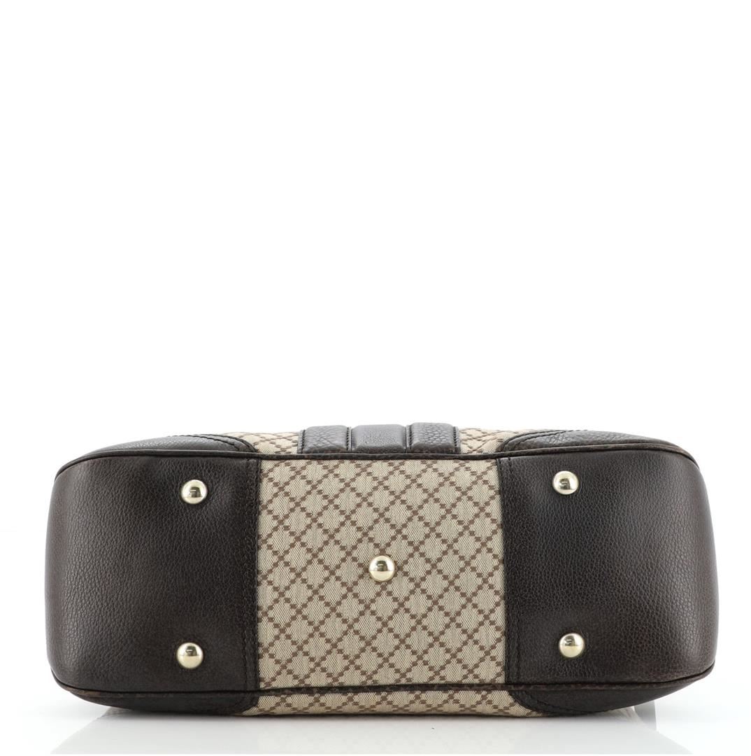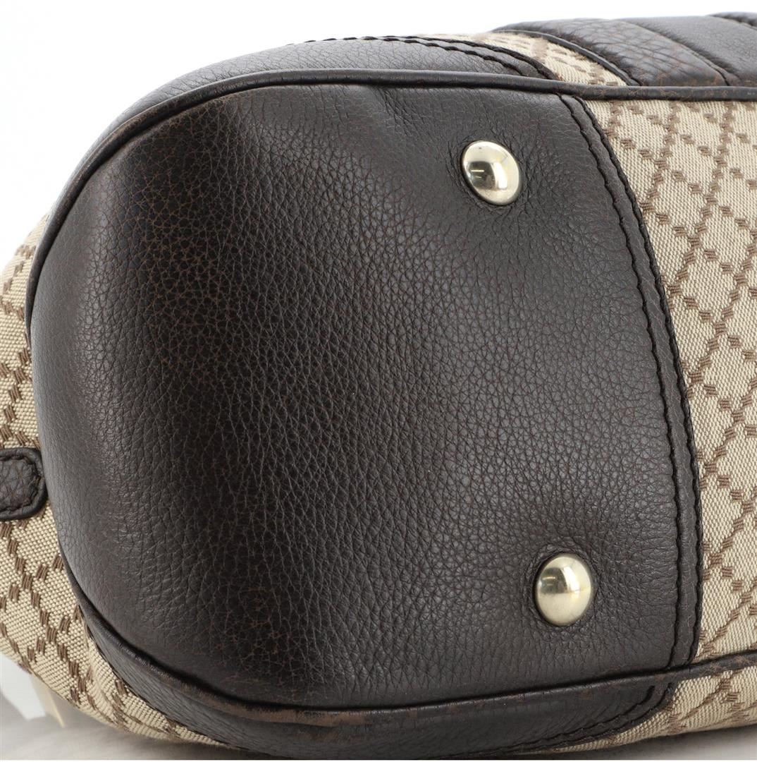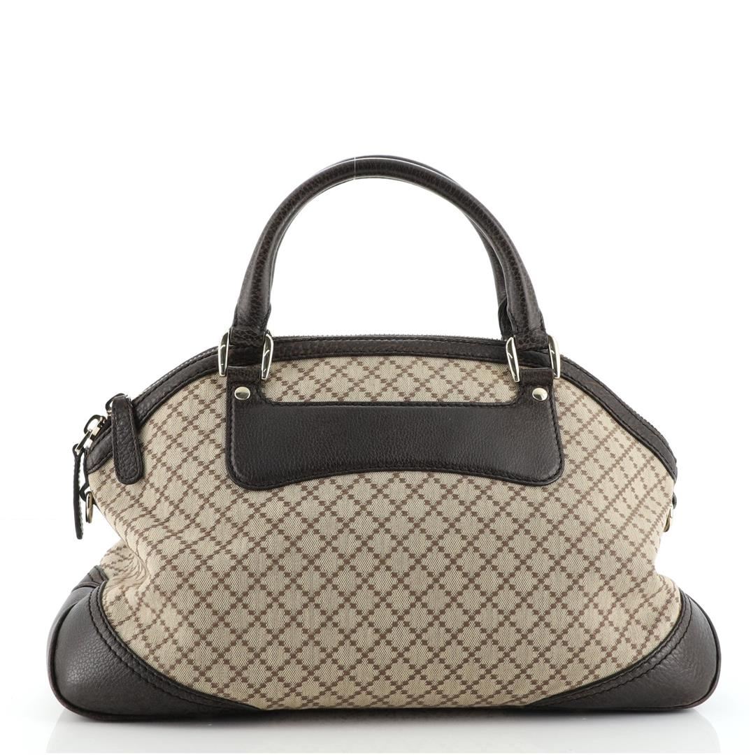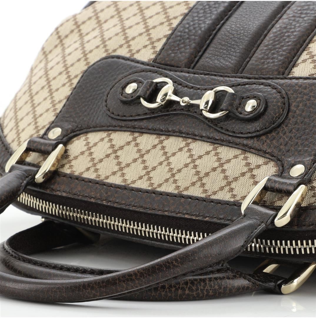 Gucci Brown Diamante Canvas Leather Cathrine Top Handle Shoulder Bag. All available information is listed in the description and shown in the photos. Gucci Brown Diamante Canvas Leather Cathrine Top Handle Bag is crafted from beige Diamante canvas and enhanced with brown leather. The bag features dual handles, the signature horsebit motif adorns its front and detachable strap. The top zip closure opens to a canvas-lined interior that houses a zip pocket and the bag is complete with protective metal feet. Condition Details: Some minor scuffs with minor discoloration at the bottom corners of the bag. Some fabric staining and markings on the interior. Height 9.5", Width 15.5", Depth 5.5", Strap Drop 13.5-15.5"