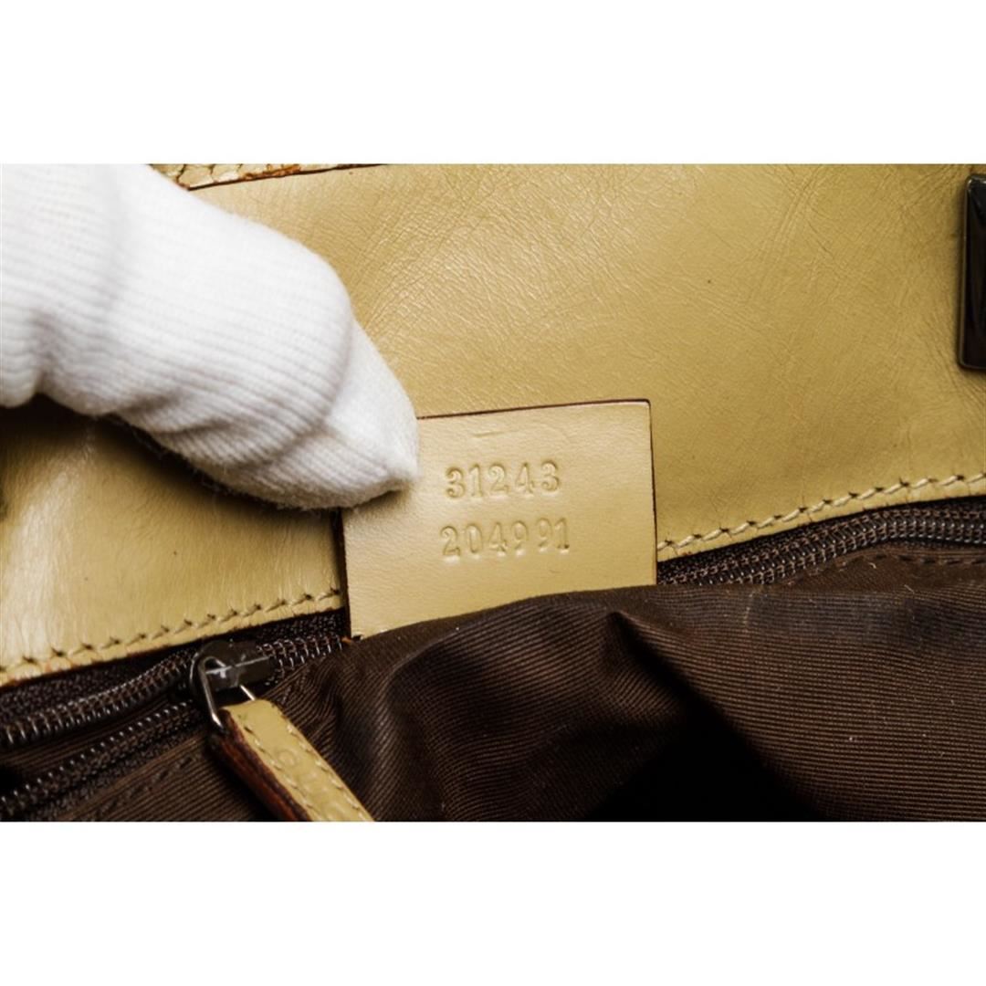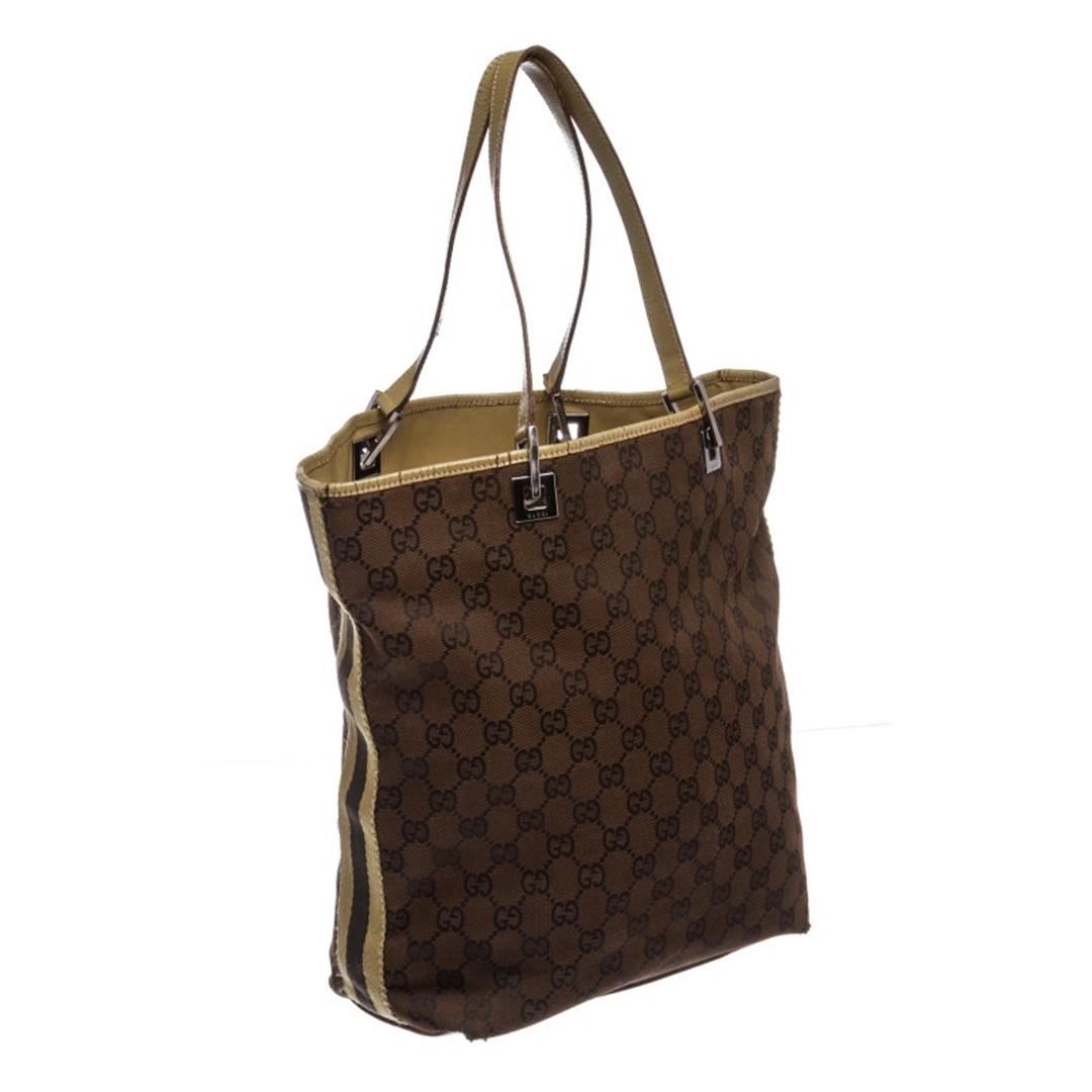 One Gucci Brown Green Canvas Leather Monogram Tote Bag. Overall top closure. Interior is nylon lined with one zipper pocket. Dual flat leather handles. Item is pre-owned.
