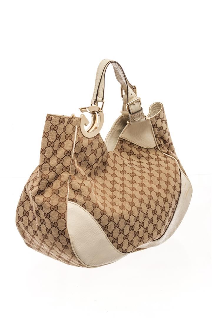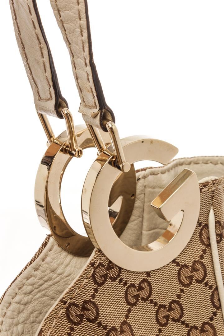 Gucci Brown Leather Charlotte GG Shoulder Bag. All available information is listed in the description and shown in the photos. gucci brown leather charlotte gg shoulder bag with printed, gold-tone hardware, leather trim, dual adjustable shoulder straps, canvas lining & single interior pocket, snap closure at top. Height: 12" Width: 15" Depth: 6", Shoulder Strap Drop: 7" / 30.48 x 38.1 x 15.24 Cm