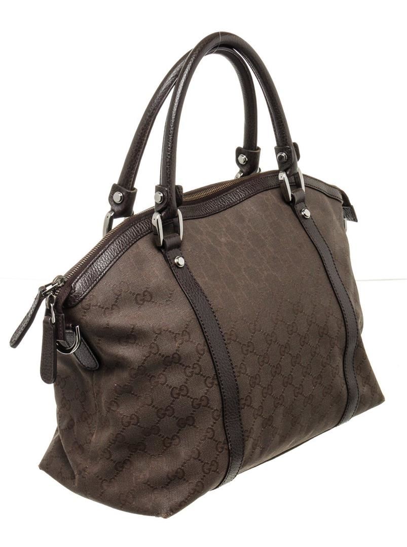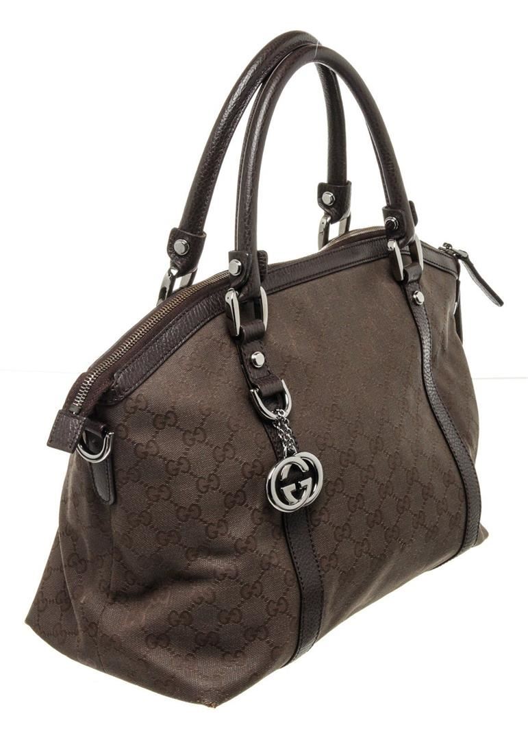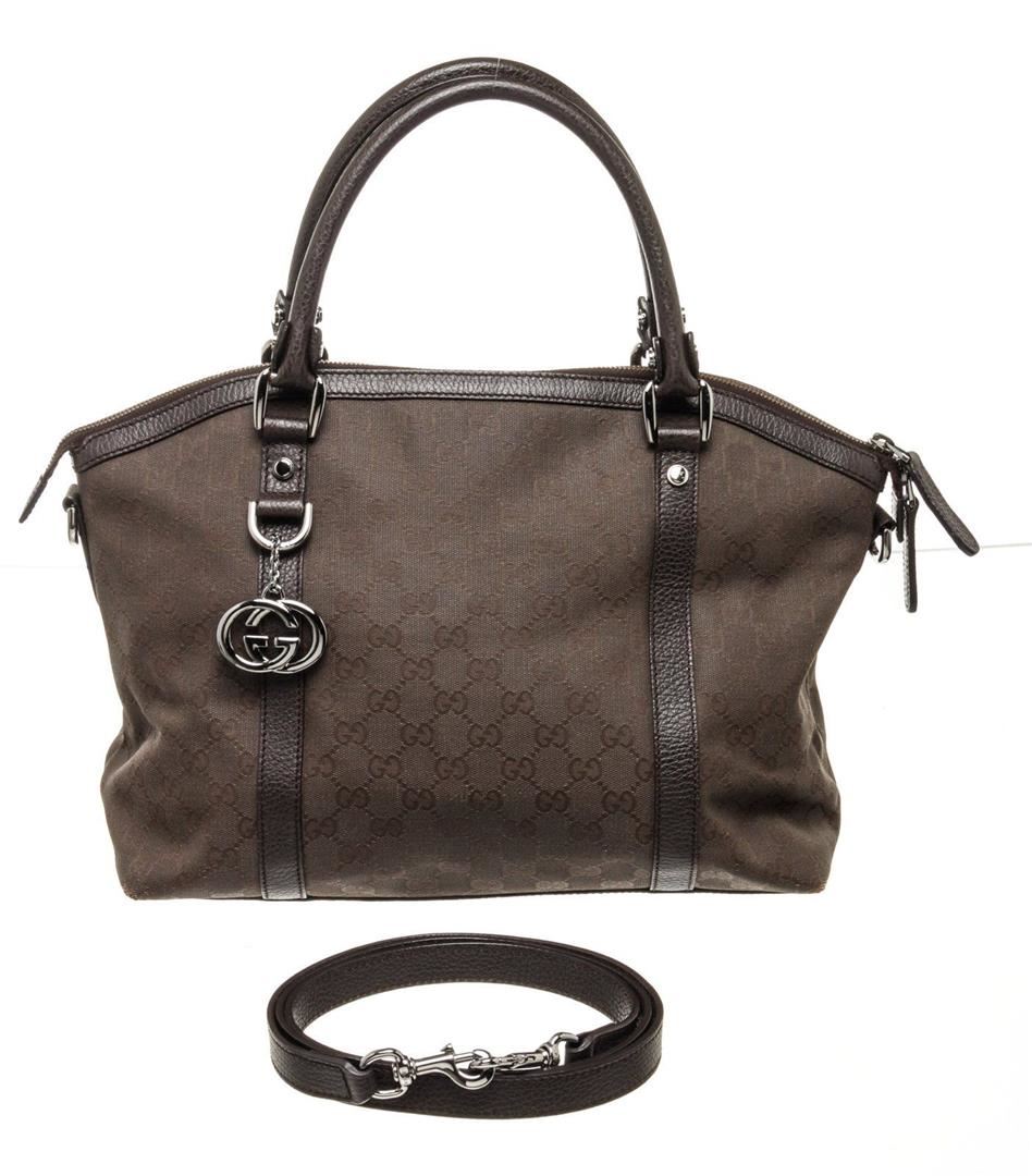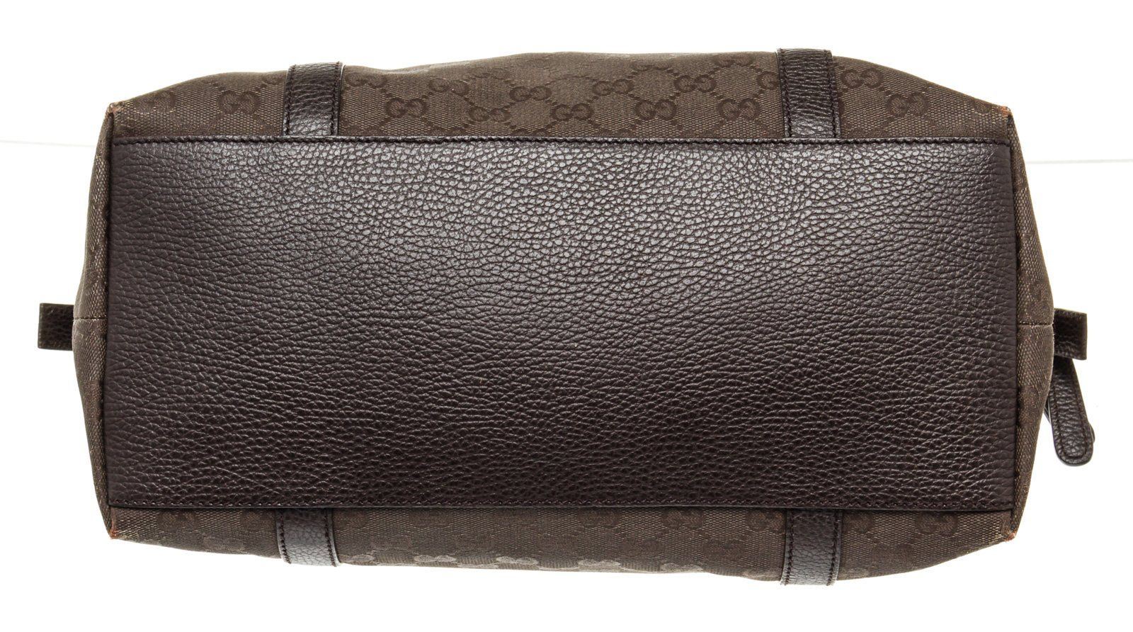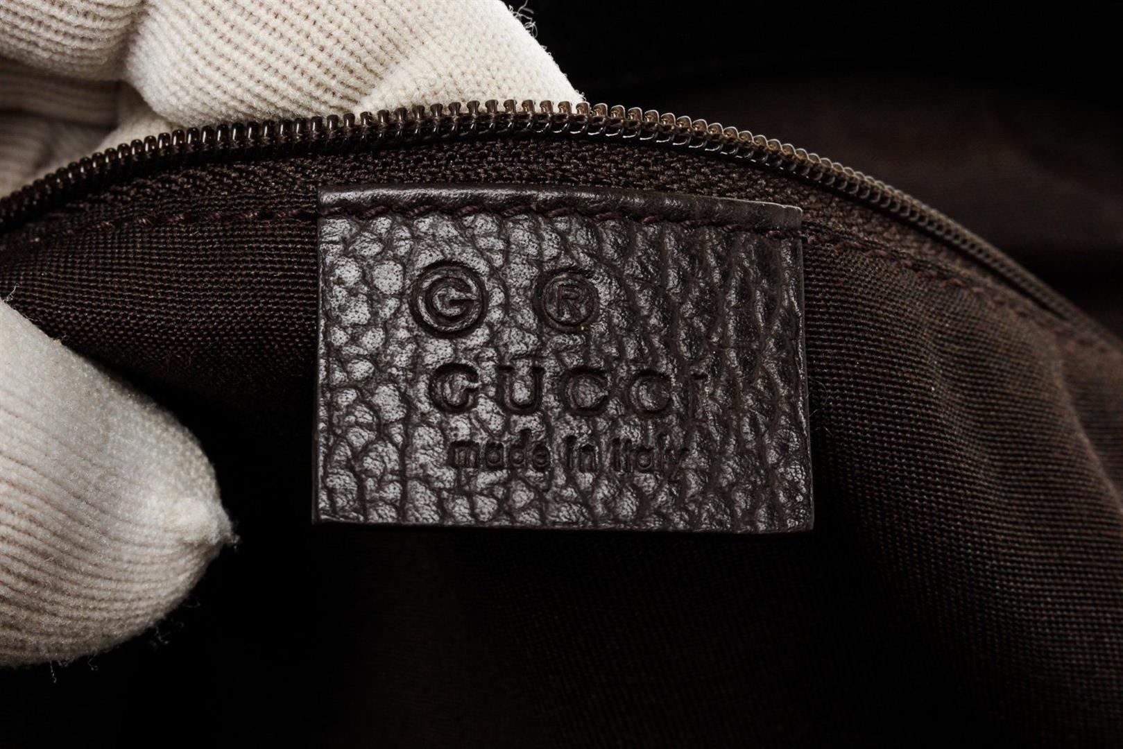 Gucci Brown Leather Shoulder Bag with leather, gold tone hardware, exterior zip pocket, interior zip pocket, canvas lining, dual top handle and zipper closure.