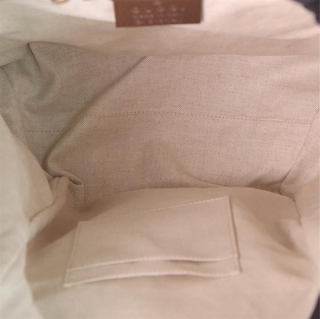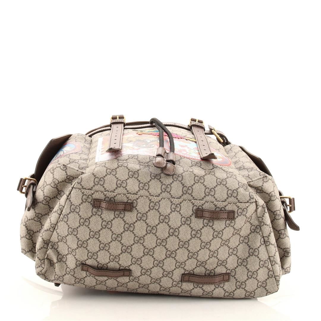 Gucci Brown Print GG Supreme Coated Canvas Donald Duck with Applique Soft Large Backpack features canvas coated soft backpack with brown leather trim, beige fine-textile interior lining, two small exterior pockets, adjustable shoulder straps, leather top handle, and drawstring closure.