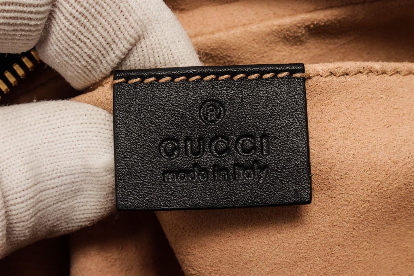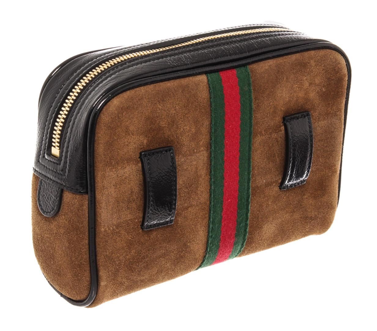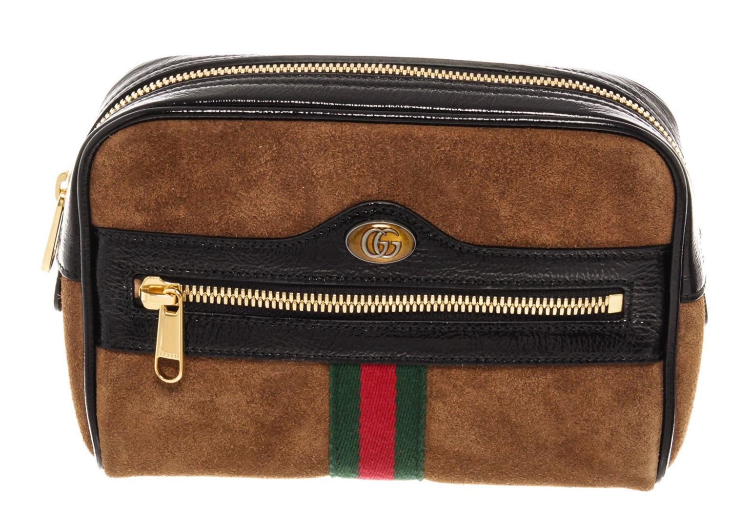 Brown suede Gucci Ophidia small waist bag with gold-tone hardware, black leather trim, an interlocking GG logo plate at front, red and green Web accent, adjustable waist strap, single exterior pocket with zipper, beige suede lining & single interior pocket and zip closure at top.