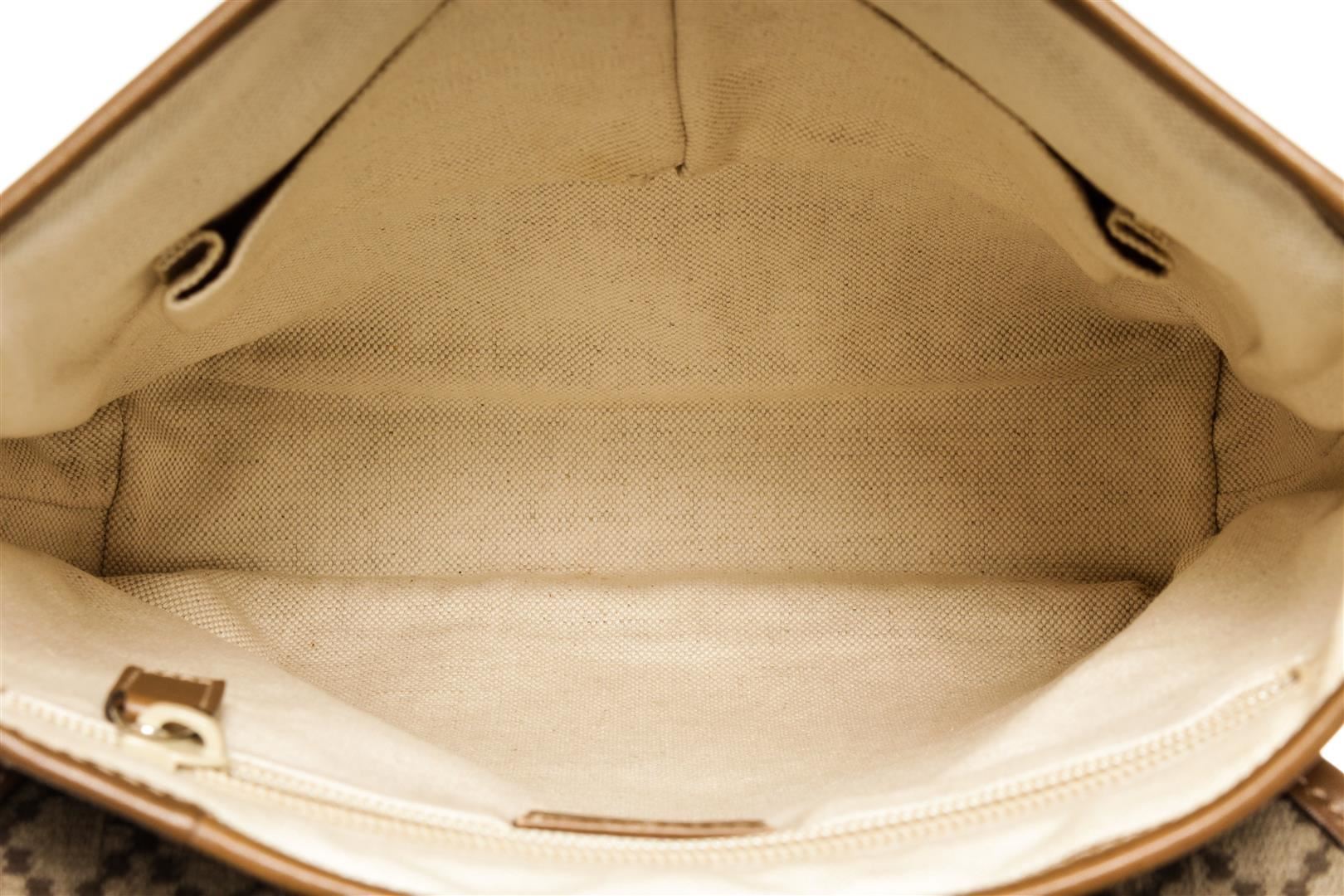 One Gucci Diamante Shoulder Bag. Item is sold AS-IS. All available information is listed in the description and shown in the photo. Gucci Diamante shoulder bag with diamond patterned canvas exterior, brown leather trim, adjustable strap, flap and snap button closure, beige fabric lining, two interior slip pockets, and one interior zip pocket.