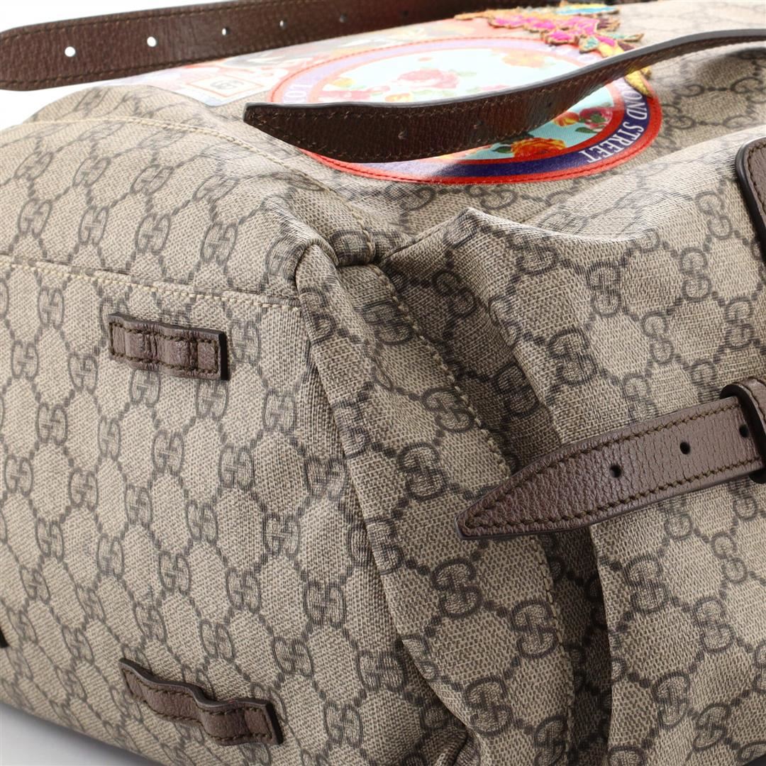 One Gucci Donald Duck Soft Backpack GG Coated Canvas with Applique Large. Item is sold AS-IS. All available information is listed in the description and shown in the photo. Gucci Donald Duck Soft Backpack GG Coated Canvas with Applique Large. Heavy creasing on exterior, minor cracking ons trap base wax edges, scratches on hardware.