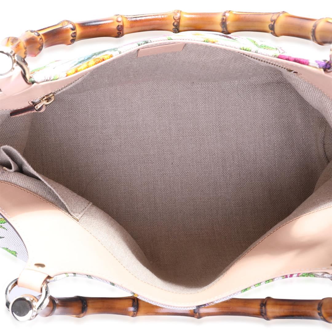 One Gucci Flora Bamboo Handle Bag. Item is sold AS-IS. Please check photos and descriptions for all available details. Gucci Multicolor Canvas Beige Leather Flora Bamboo Handle Bag. Features silver hardware, bamboo handles, pink canvas interior, and beige leather lining.