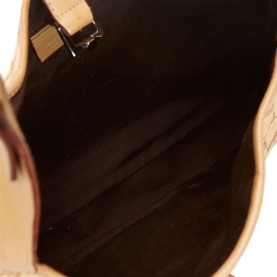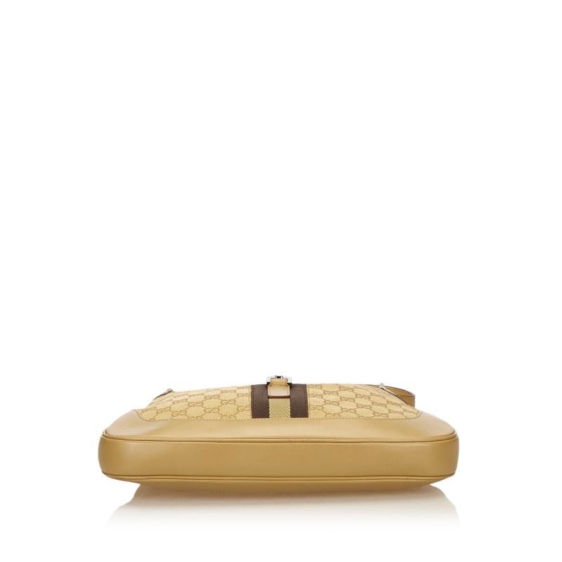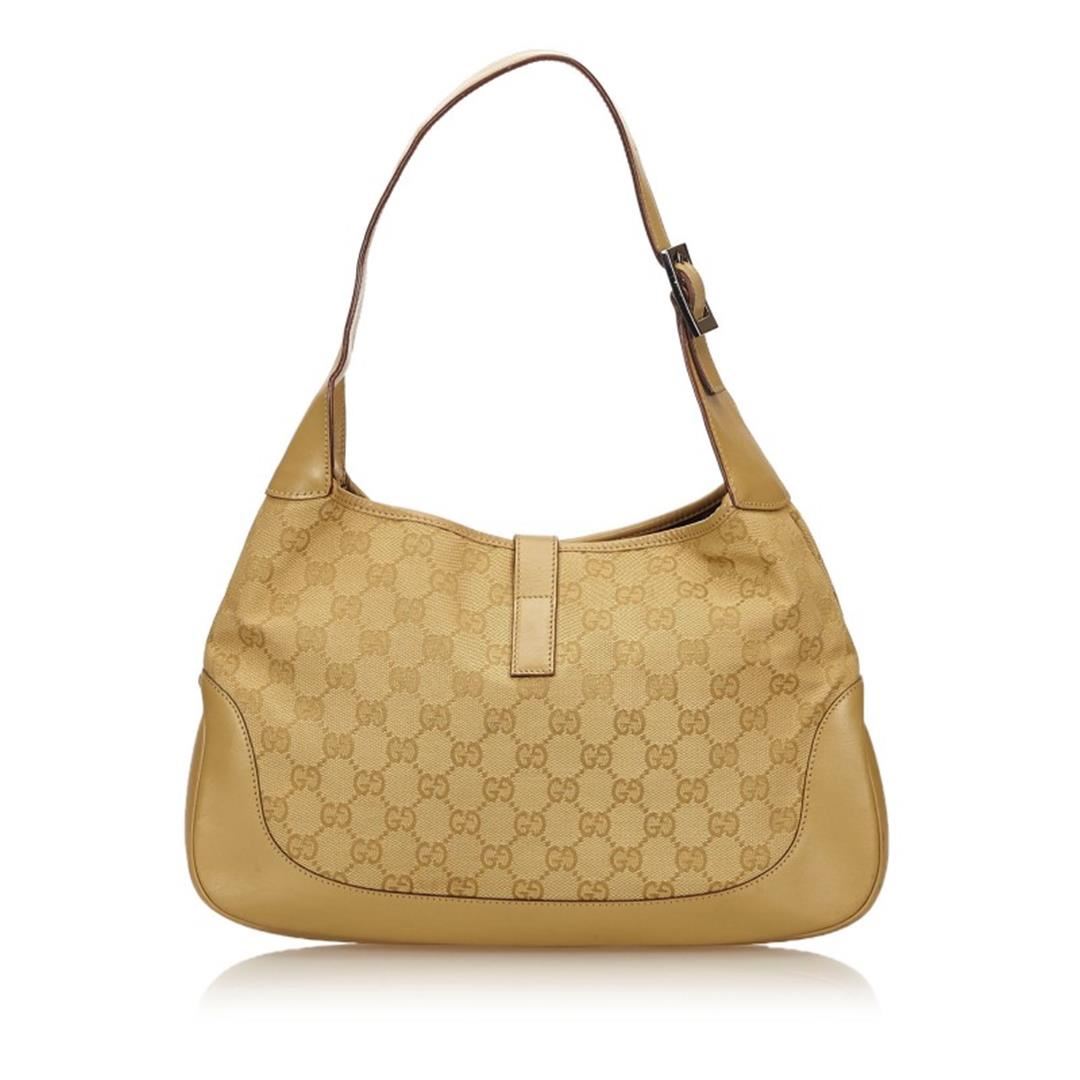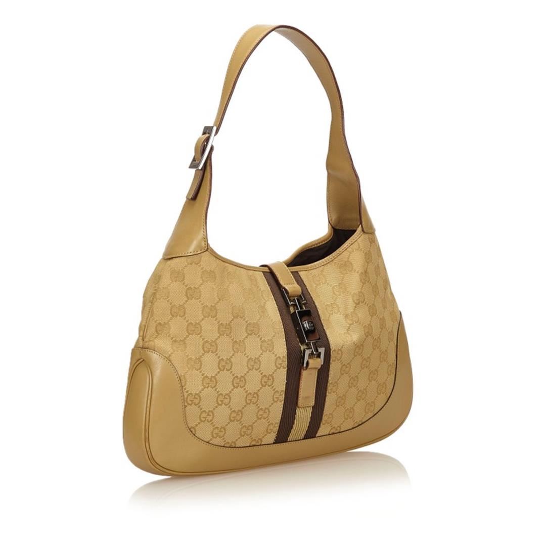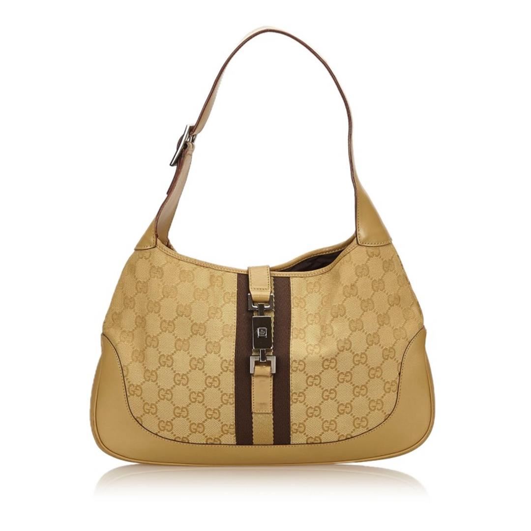 One Gucci Gold Brown Canvas Leather Jacquard Jackie Bag. The Jackie features a jacquard body, an adjustable shoulder strap, a leather trim, a front strap with a push lock closure, and an interior zip pocket.