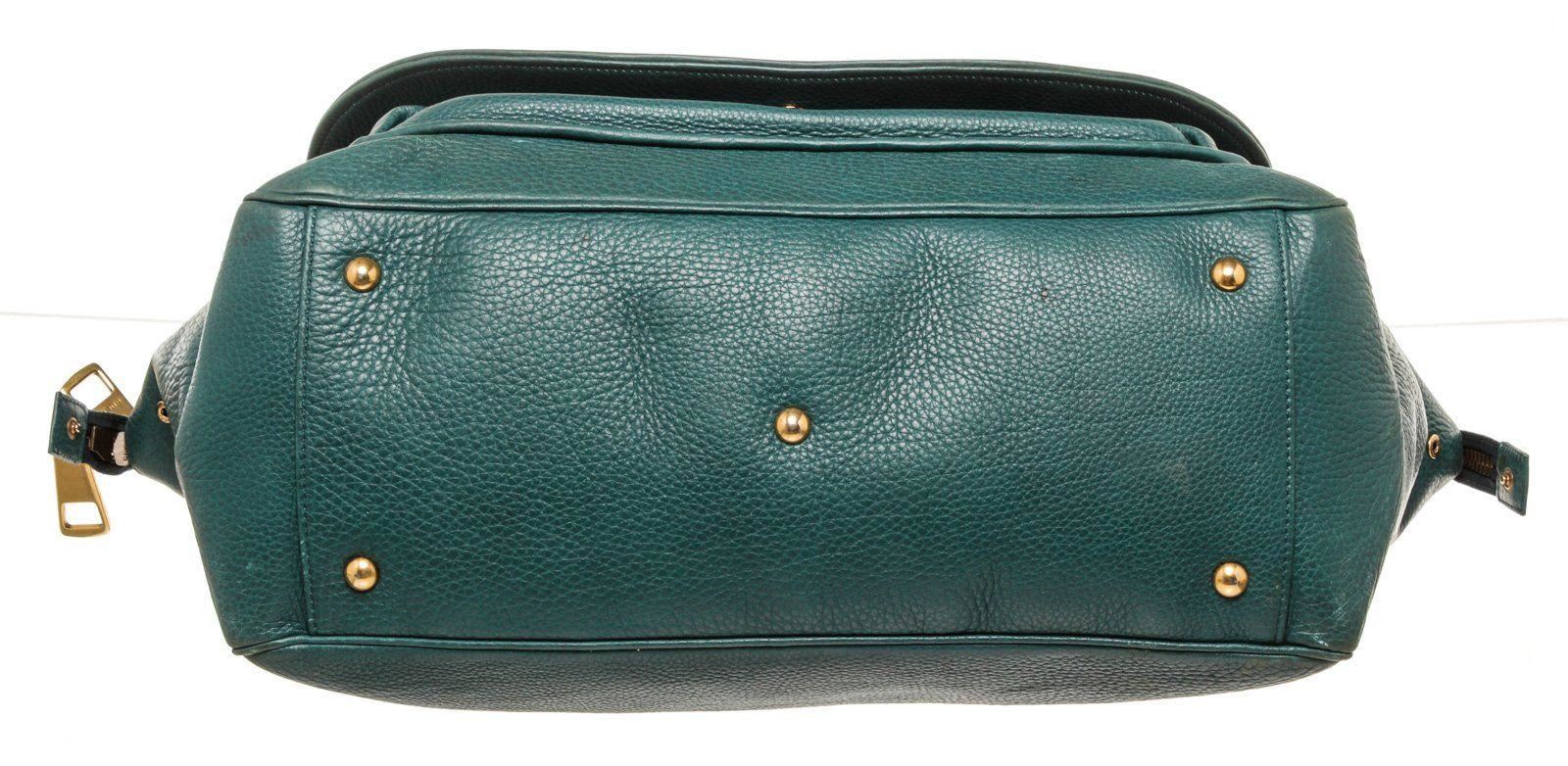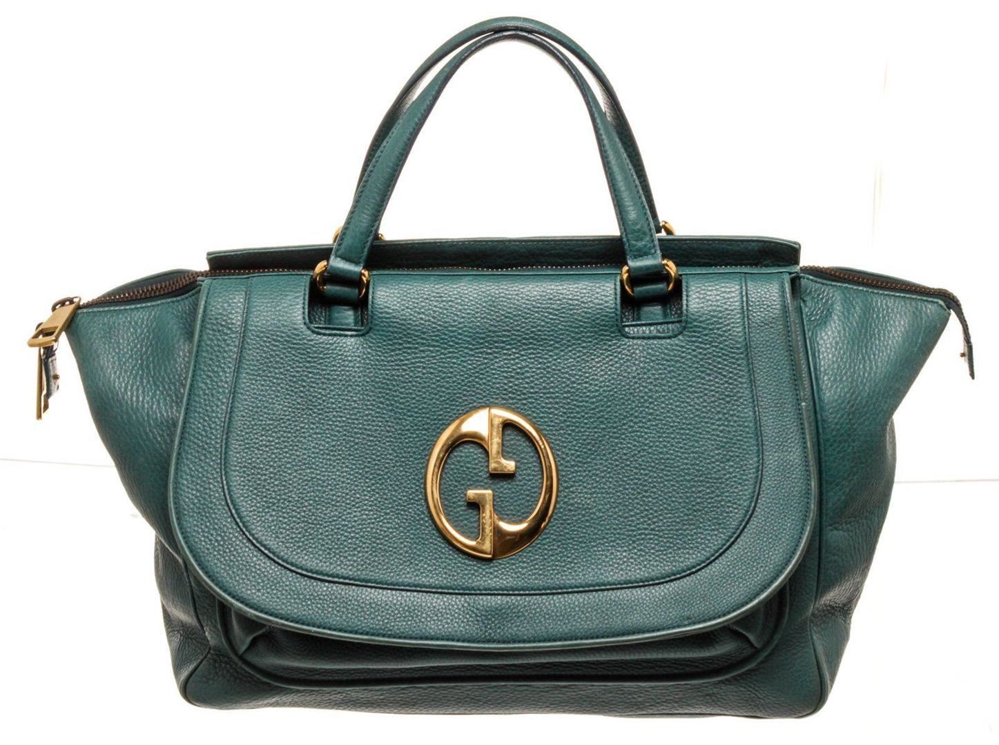 Gucci Green Leather 1973 Interlocking Shoulder Bag with leather trim and interlocking G, rolled leather handles, top zip closure, and interior zip pocket.