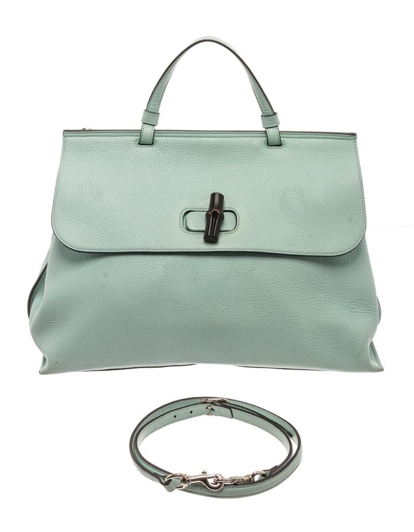 Gucci Green Leather Daily Bamboo 2Way Satchel Bag. All available information is listed in the description and shown in the photos. with hardware silver-tone, a dark brown bamboo turn-lock and is lined in pastel rose colored striped canvas with one zip pocket against the back and two small open pockets against the front. comes with a detachable shoulder-strap. Height: 9.8" Width: 15.6" Depth: 5.9", Handle Drop: 4.3" / 25 x 40 x 15 Cm