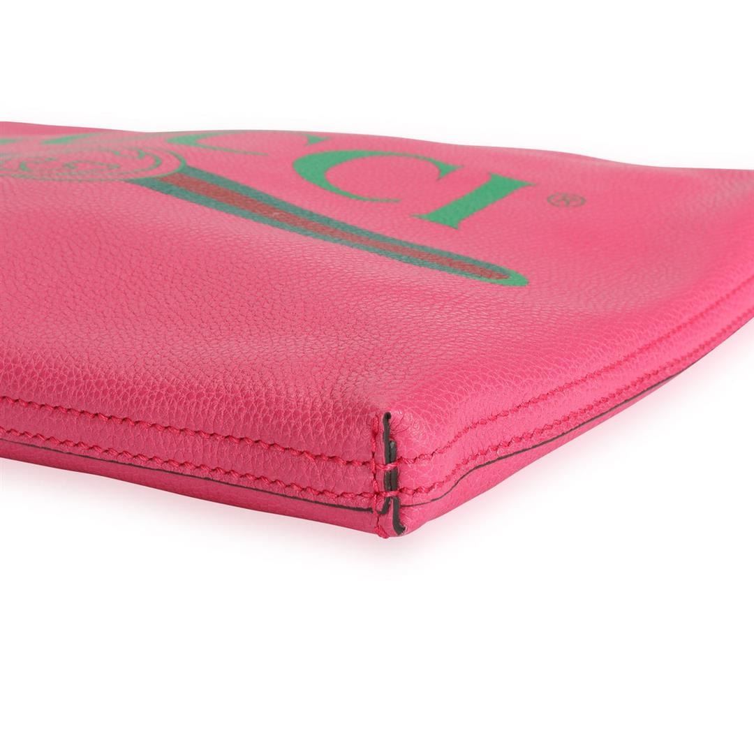 One Gucci Hot Pink Leather Portfolio Clutch. Item is sold AS-IS. All available information is listed in the description and shown in the photo. Gucci Hot Pink Leather Portfolio Clutch. Features gold hardware, pink canvas interior, pink leather exterior, and a gold zipper closure.