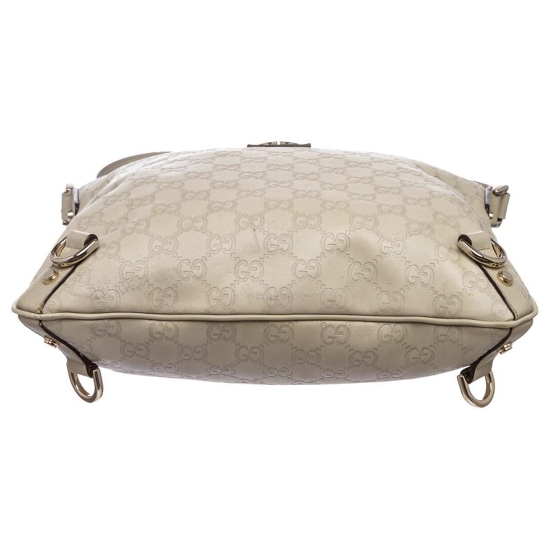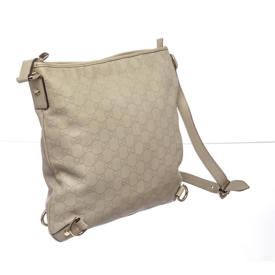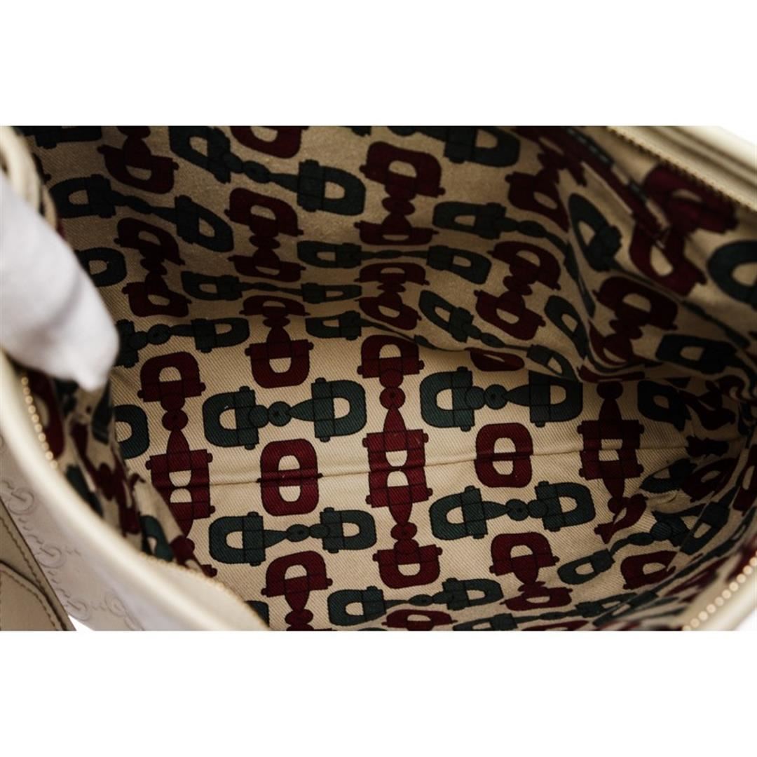 Ivory Gucci guccissima monogram leather crossbody messenger with silver tone hardward, adjustable flat leather strap, horsebit printed canvas lining, one zipper compartment at interior wall, oneip pocket and overall zipper closure. Item is pre-owned.