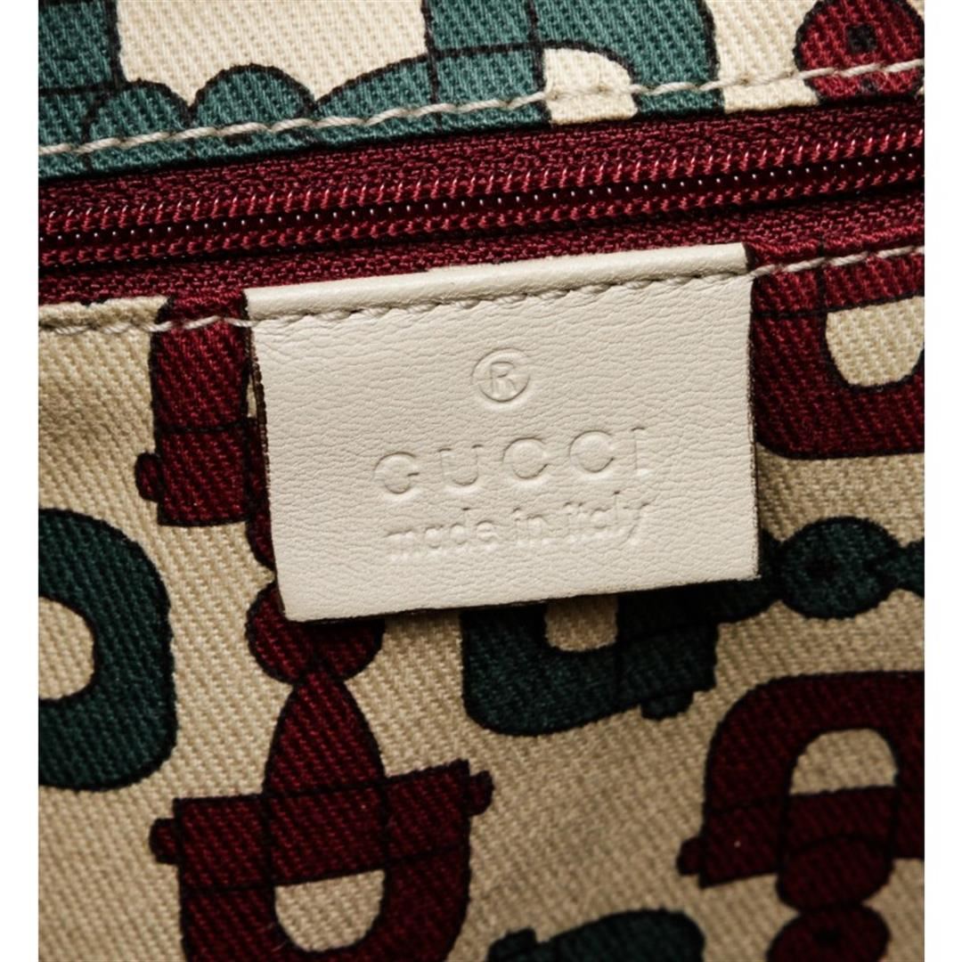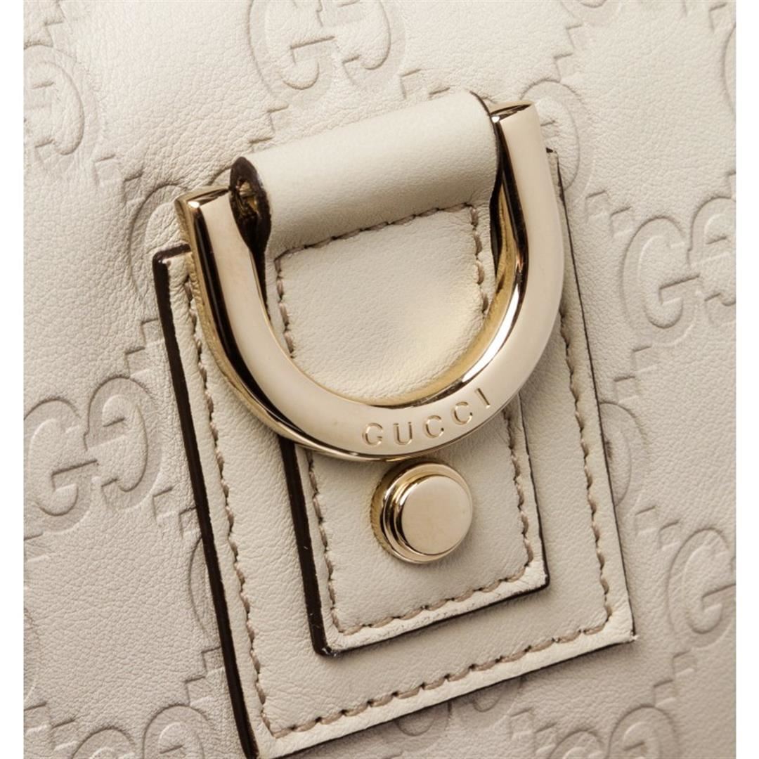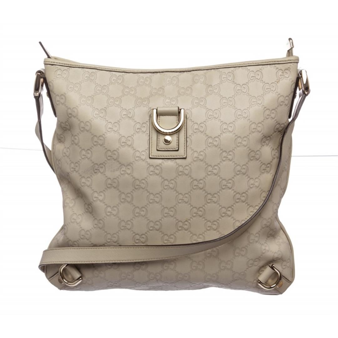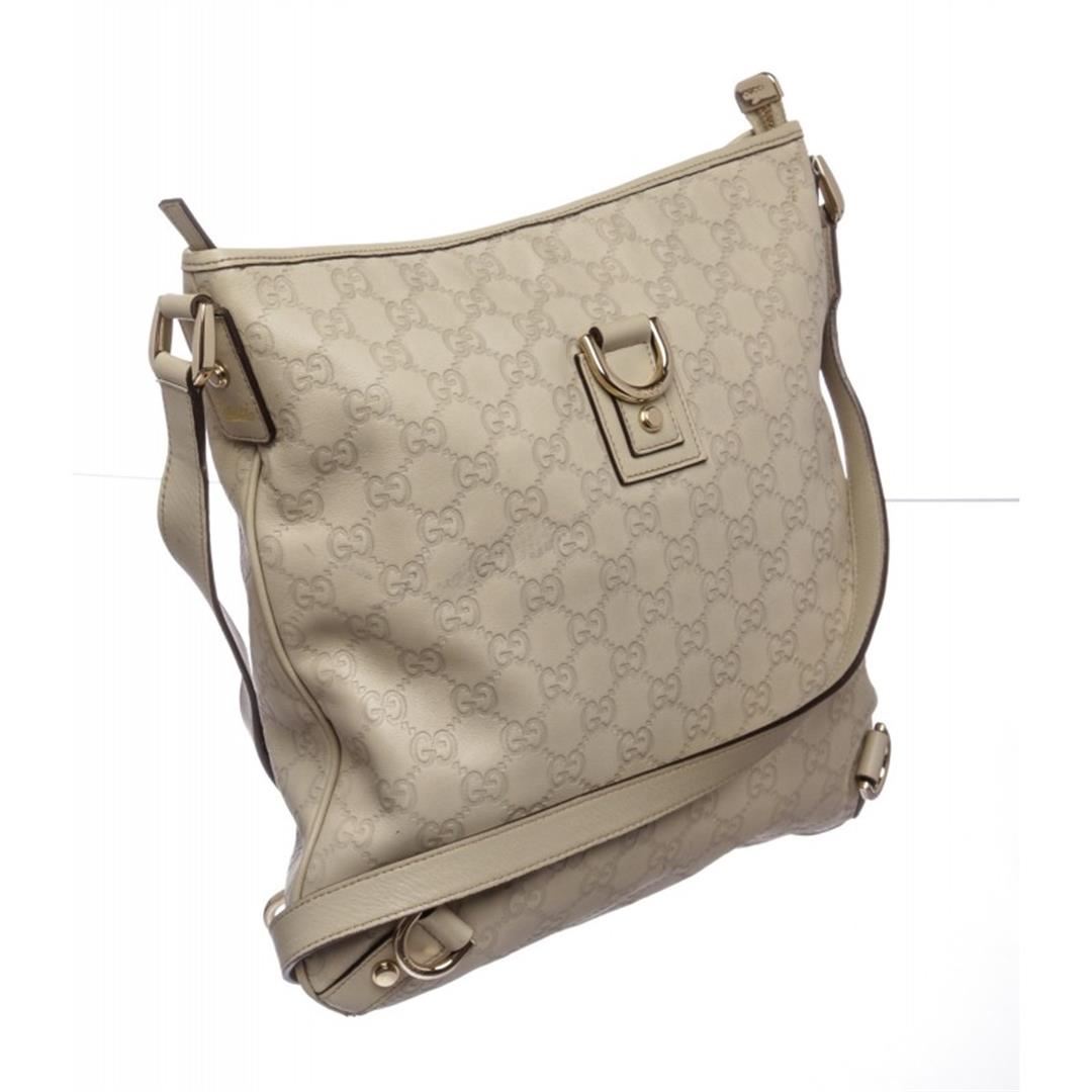 Ivory Gucci guccissima monogram leather crossbody messenger with silver tone hardward, adjustable flat leather strap, horsebit printed canvas lining, one zipper compartment at interior wall, oneip pocket and overall zipper closure. Item is pre-owned.