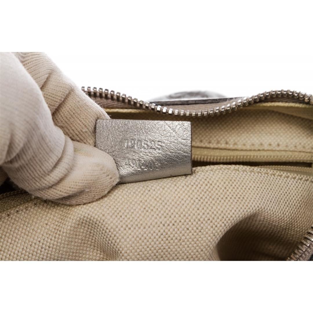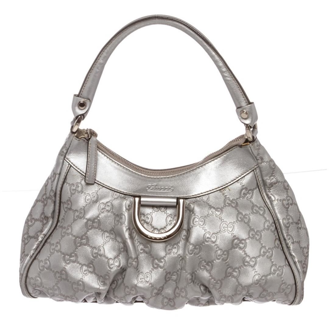 Metallic Silver Guccissima leather Gucci D-Ring hobo with silver-tone hardware, single rolled top handle, silver-tone D-ring embellishment at front face, cream twill lining, single pocket at interior wall with zip closure and zip closure at top.