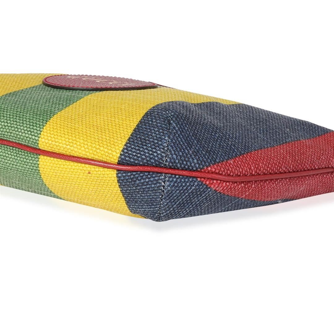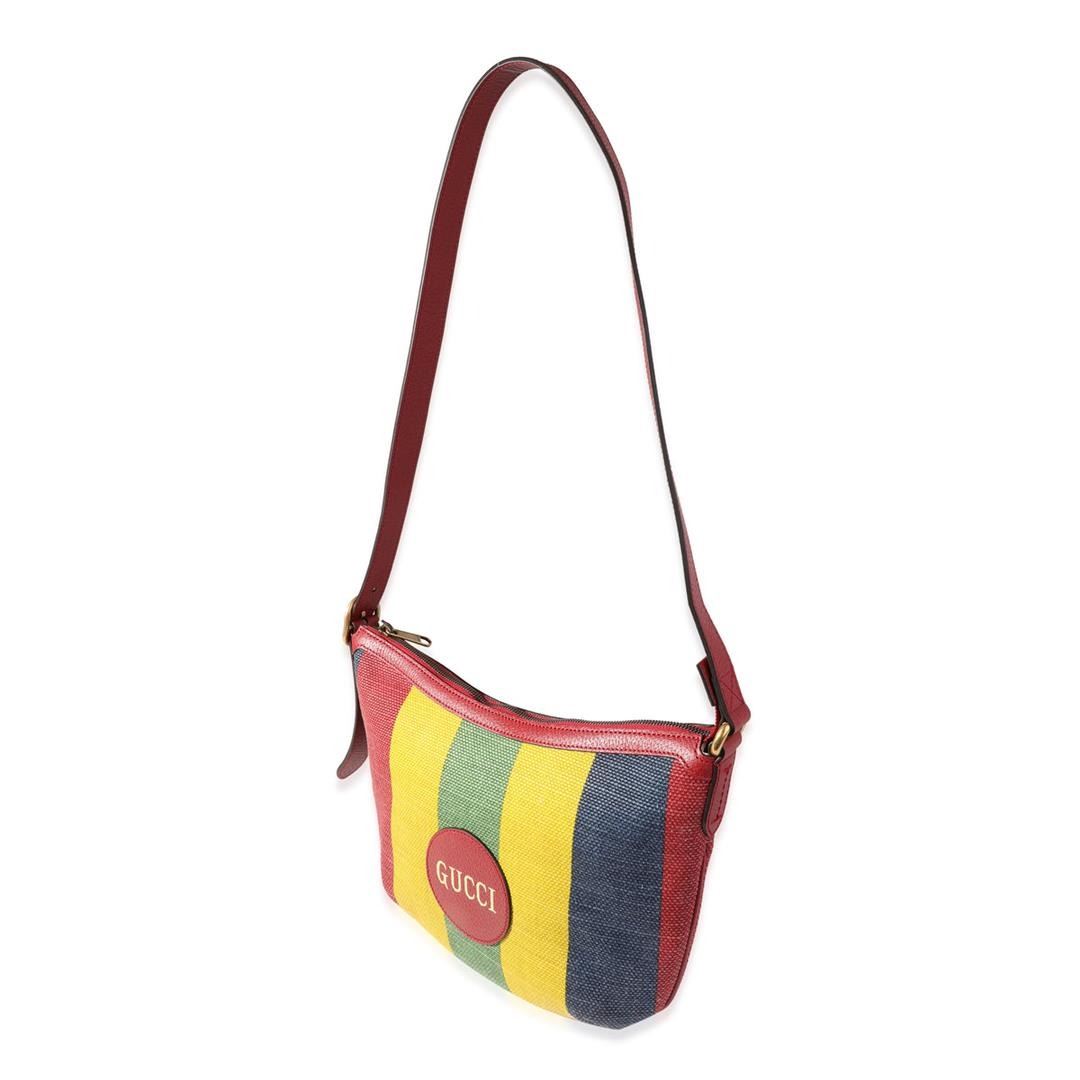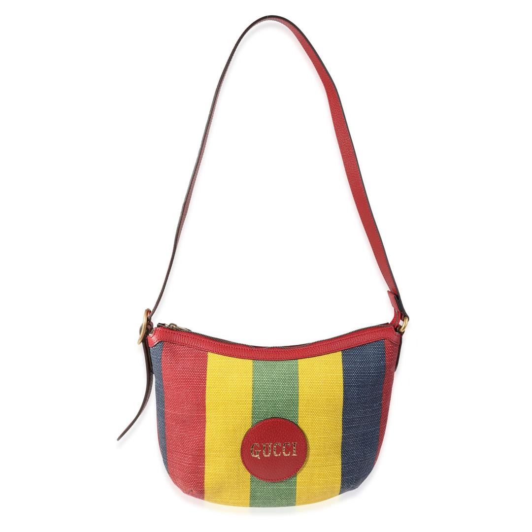 One Gucci Multicolor Striped Canvas Hobo Bag. Item is sold AS-IS. All available information is listed in the description and shown in the photo. Gucci Multicolor Striped Canvas Hobo Bag. Features gold hardware, red leather strap, white canvas interior with a zipper pocket, and a gold zipper closure.