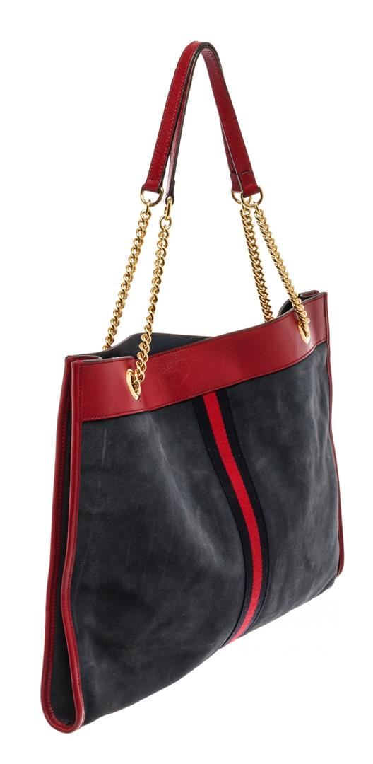 Gucci Navy Red Suede Leather Large NY Yankees Rajah Chain Tote Bag. All available information is listed in the description and shown in the photos. Gucci Navy Red Suede Leather Large NY Yankees Rajah Chain Tote Bag with blue canvas, gold-tone hardware, leather trim, dual shoulder straps, chain-link shoulder straps, leather, embroidered & crystal accents, leather lining, snap closure at top, includes dust bag & interior zip pouch. Height: 14.25" Width: 17.25" Depth: 1.75", Shoulder Strap Drop: 10.25" / 36.19 x 43.81 x 4.44 Cm