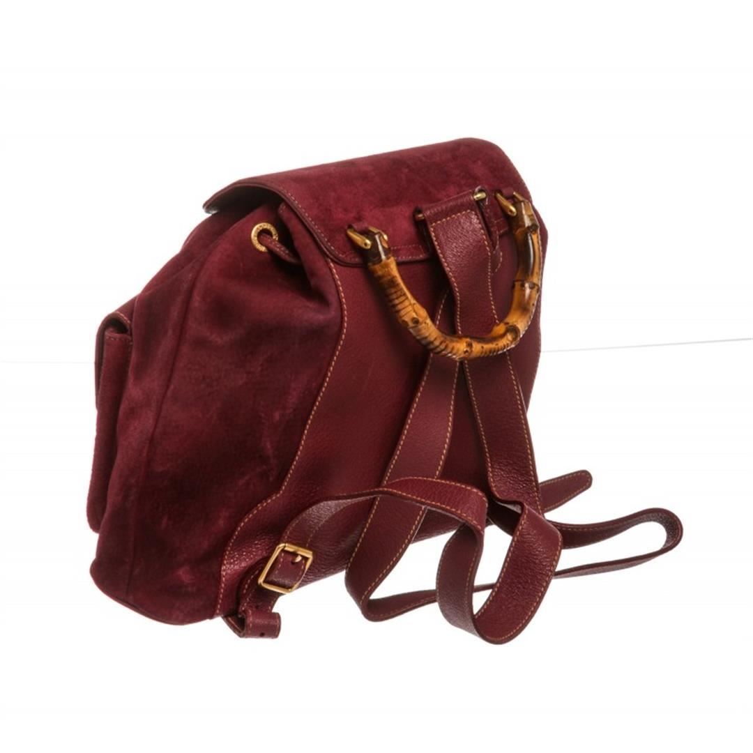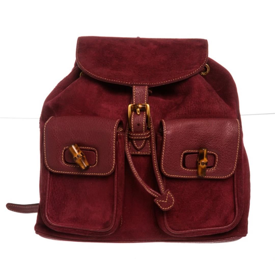 One Gucci Purple Suede Leather Trim Drawstring Bamboo Backpack. Overall flap push tab and drawstring closure. Interior contains fabric lining with one zipper pocket. Exterior contains adjustable straps, dual flap leather pockets with bamboo twist lock and