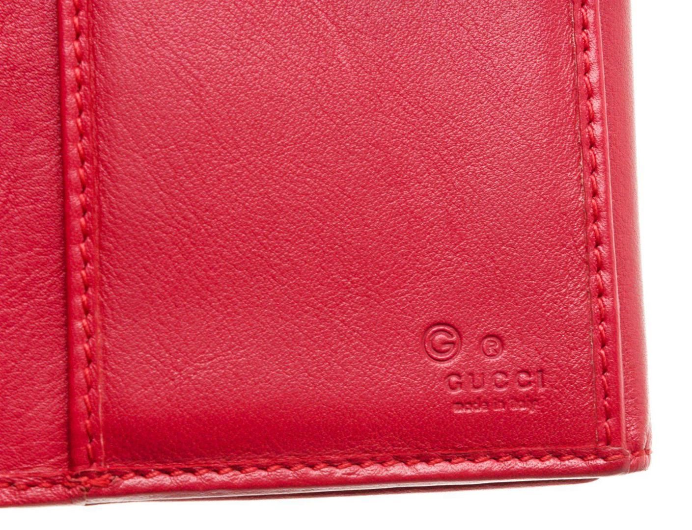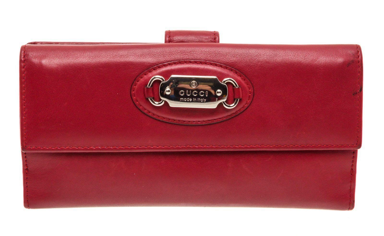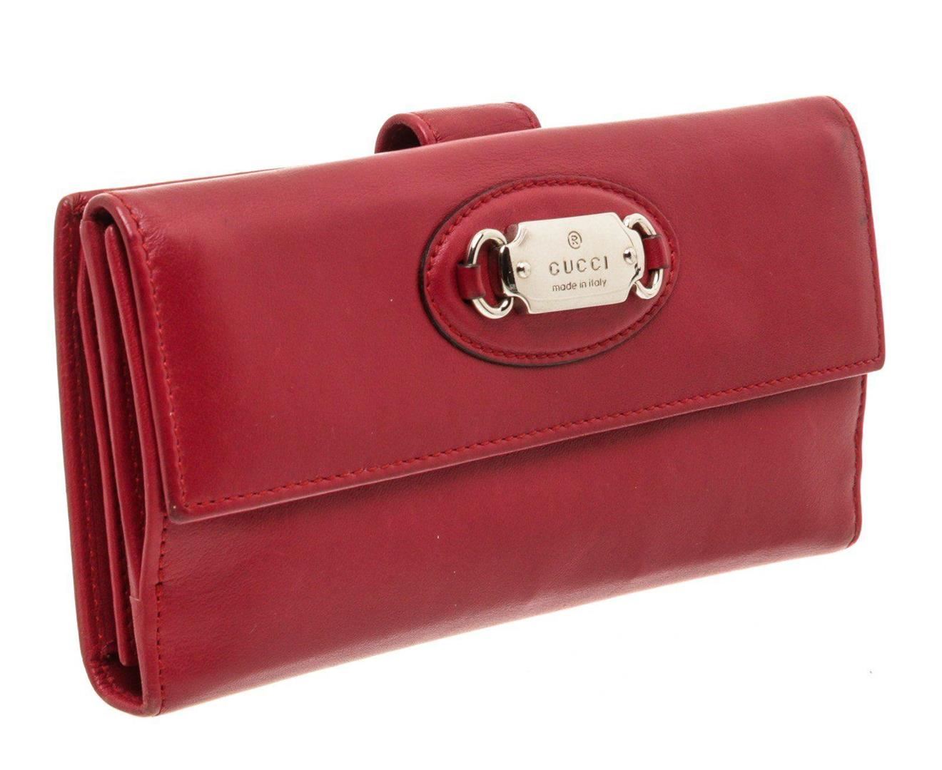 Gucci red leather continental wallet with silver-tone hardware, four bill pockets, seven card holders, large change pocket, snap closure. Measurements: Length: 7.5 in / 19 cm Width: 1 in / 3 cm 4 in / 10 cm Condition: Pre-Owned Good overall, please see photographs for detail.