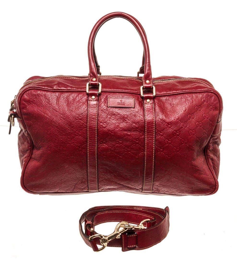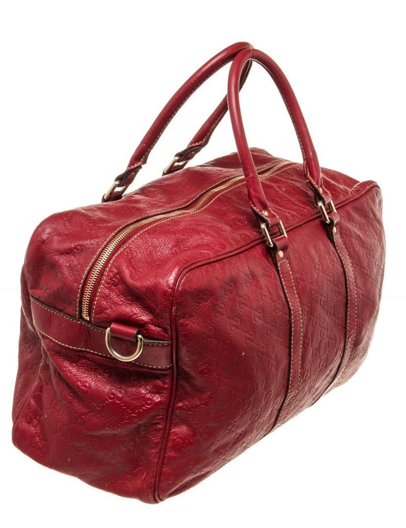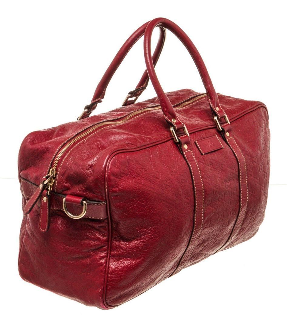 Gucci Red Leather Travel Bag with leather, gold-tone hardware, interior slip pockets, dual top handle and zipper closure.