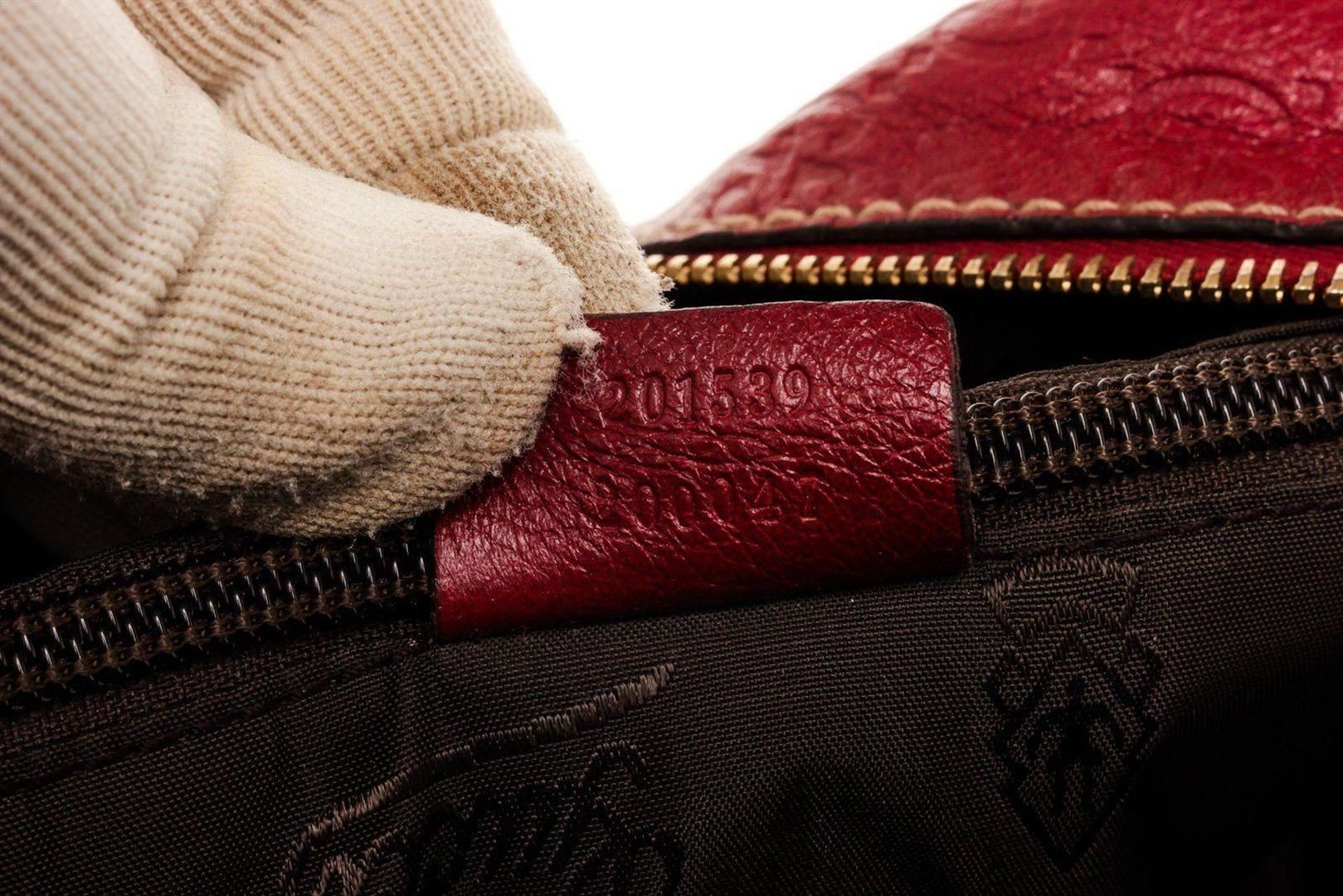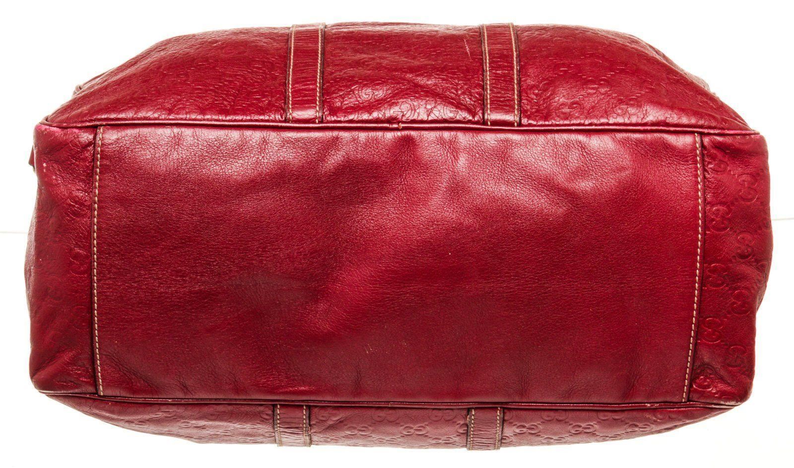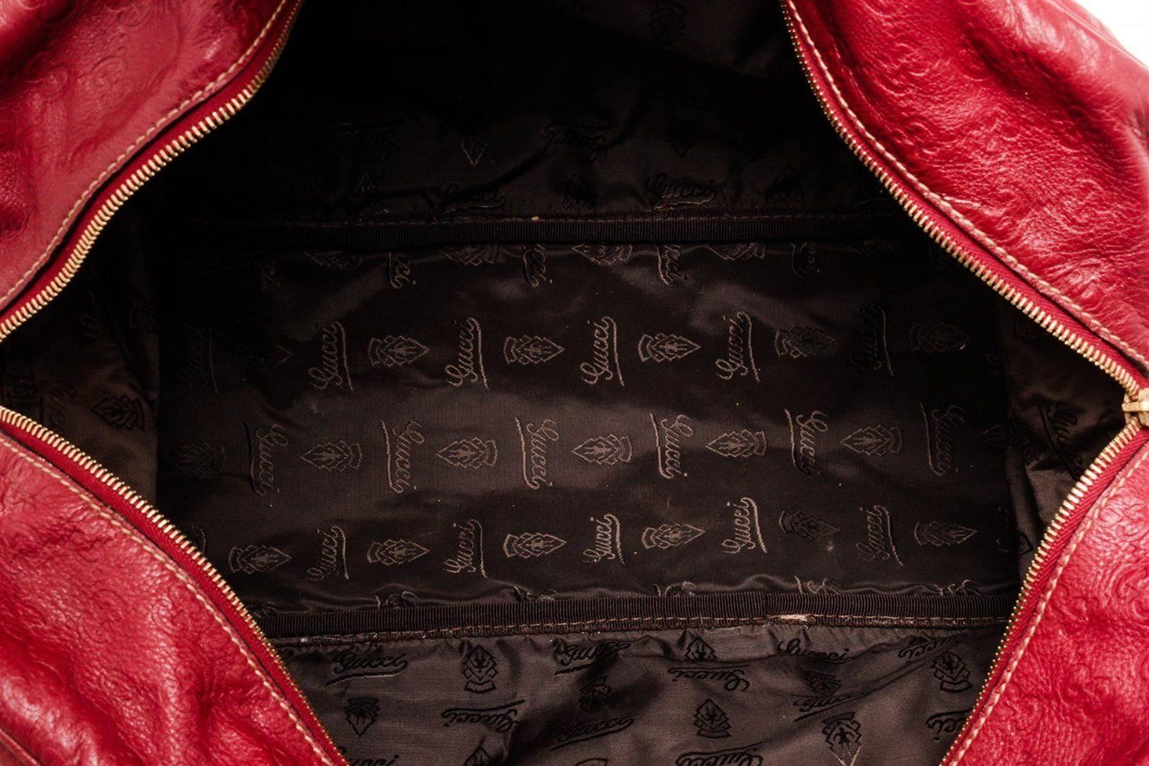Gucci Red Leather Travel Bag with leather, gold-tone hardware, interior slip pockets, dual top handle and zipper closure.