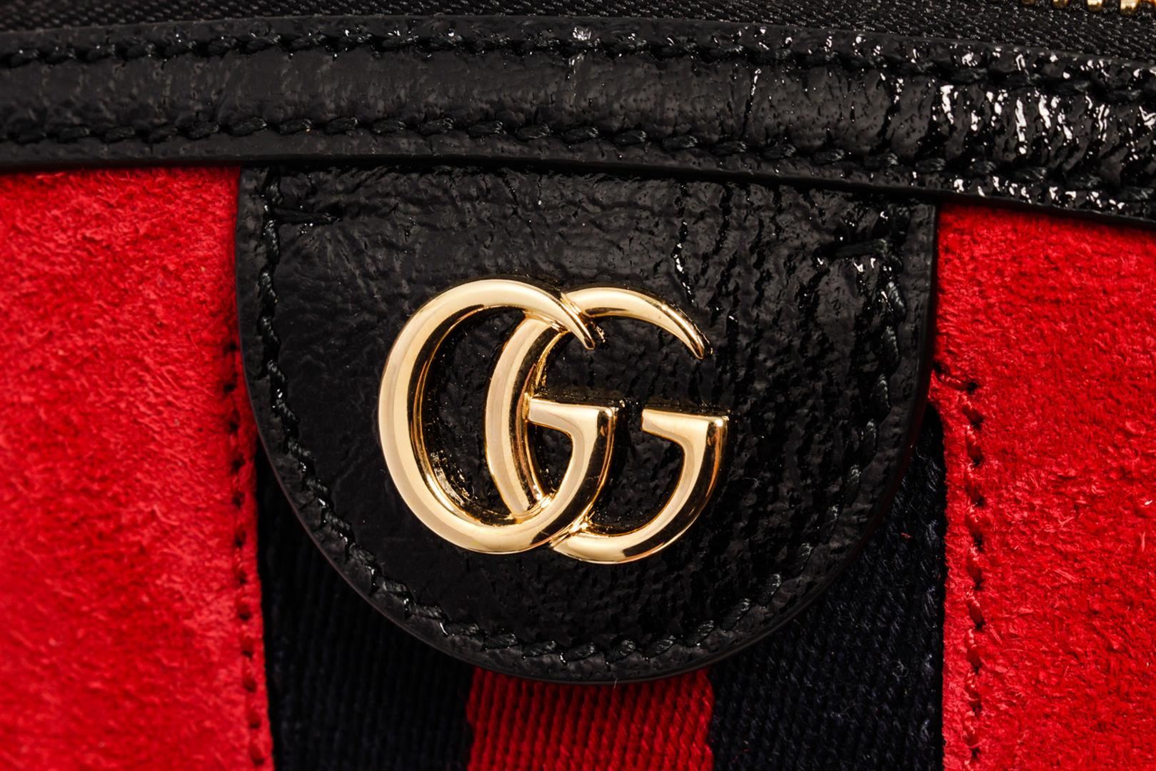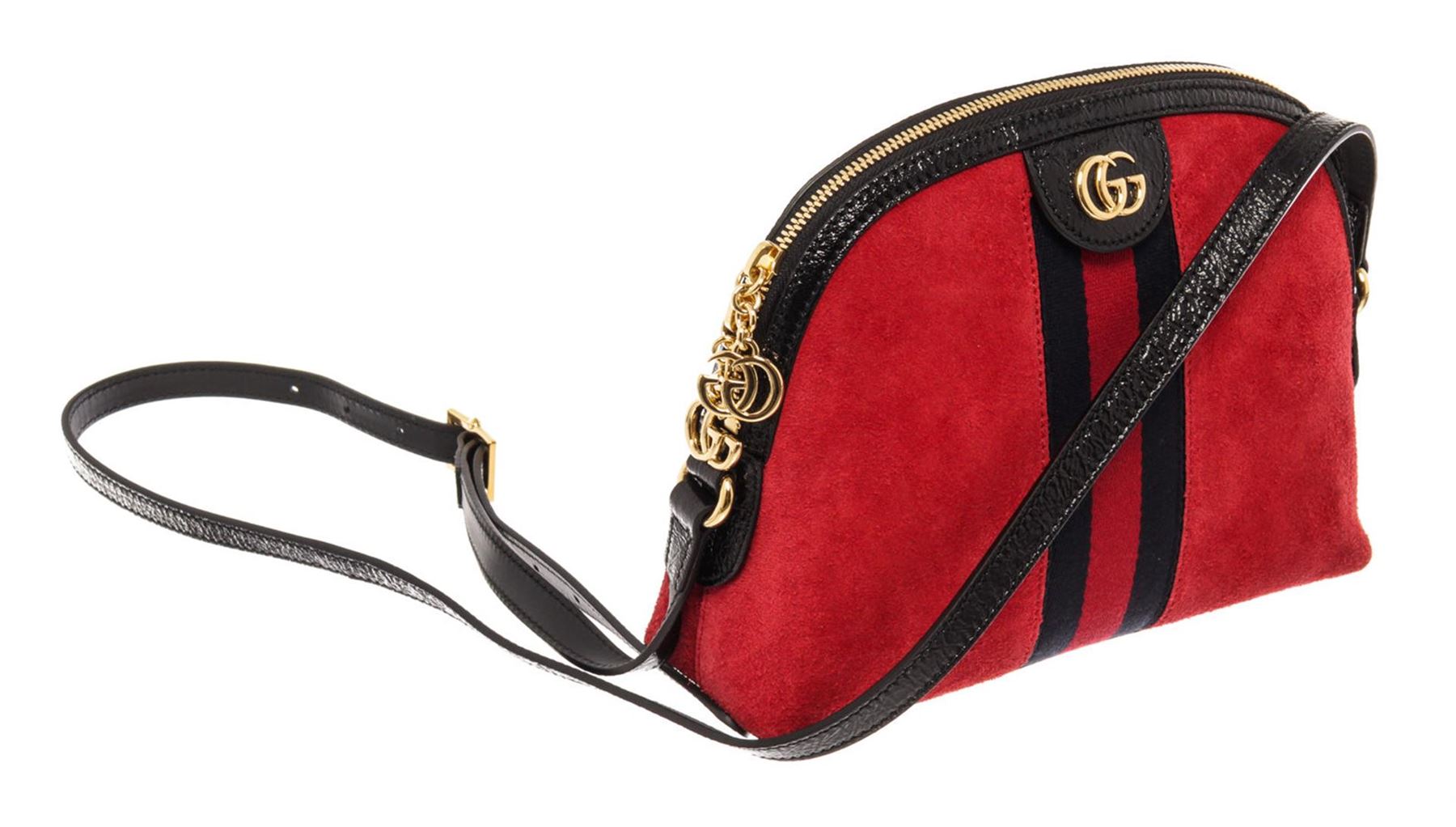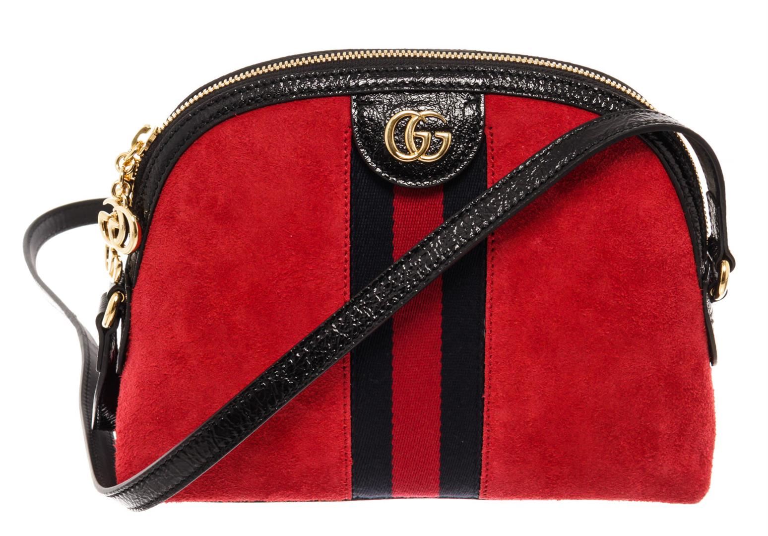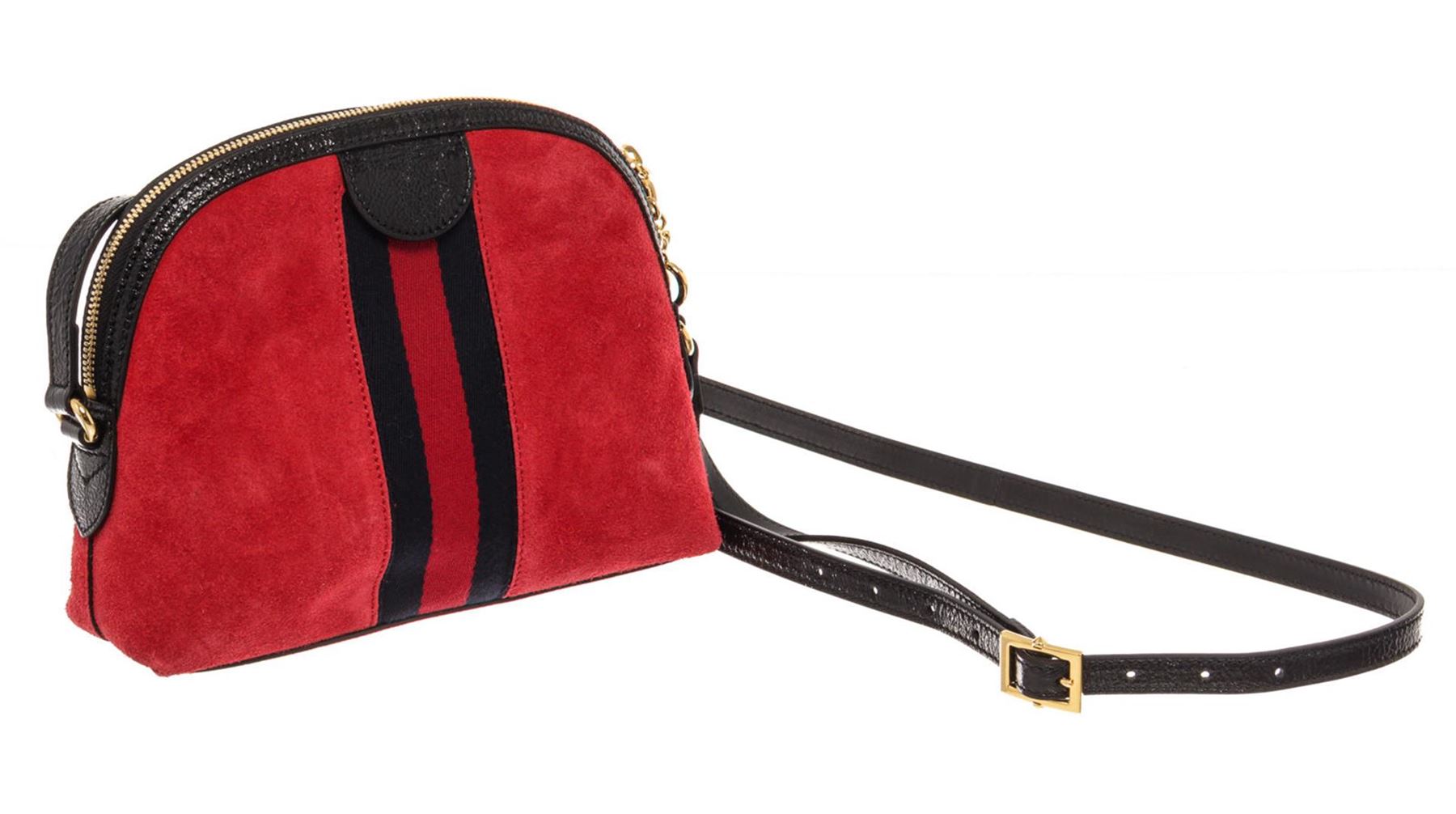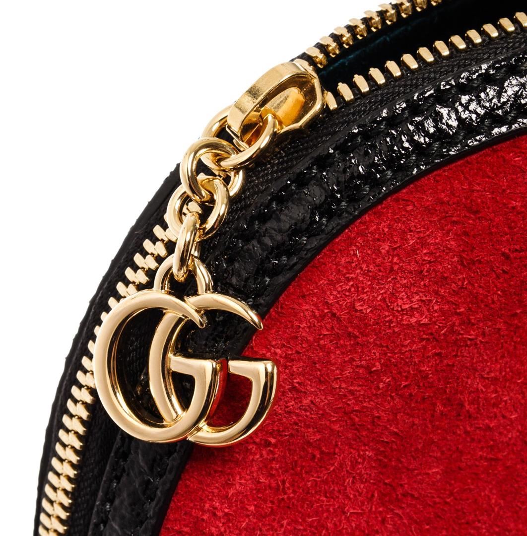 With its sleek design and spacious interior, Gucci Ophidia Dome shoulder bag can comfortably hold all your essentials. This bag is crafted from red suede and black patent leather with the classic navy blue and red Vintage Web strip and gold-tone hardware.