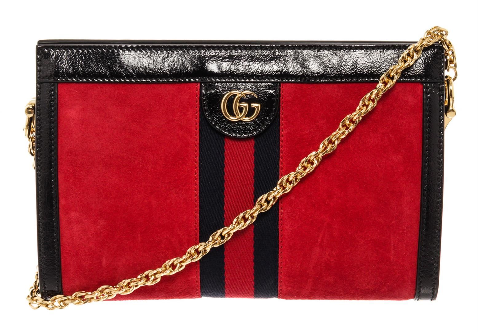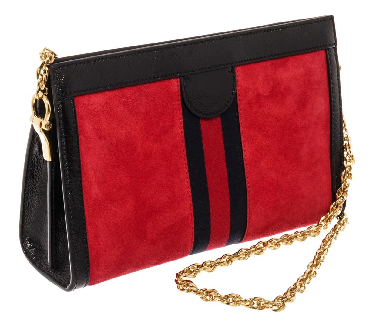 With its sleek design and spacious interior, Gucci Ophidia small shoulder bag can comfortably hold all your essentials. This bag is crafted from red suede and black patent leather with the classic navy blue and red Vintage Web strip and gold-tone hardware