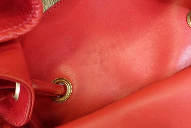 This Gucci backpack features a red suede body, gold-tone hardware, dual flat leather shoulder straps, beige canvas lining, one zip pocket inside, drawstring closure at top with flap and buckle closure above. Length: 13.4", Width: 14.2", Depth: 6.3", Sh