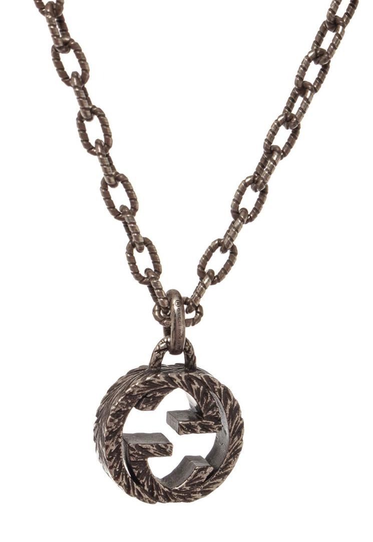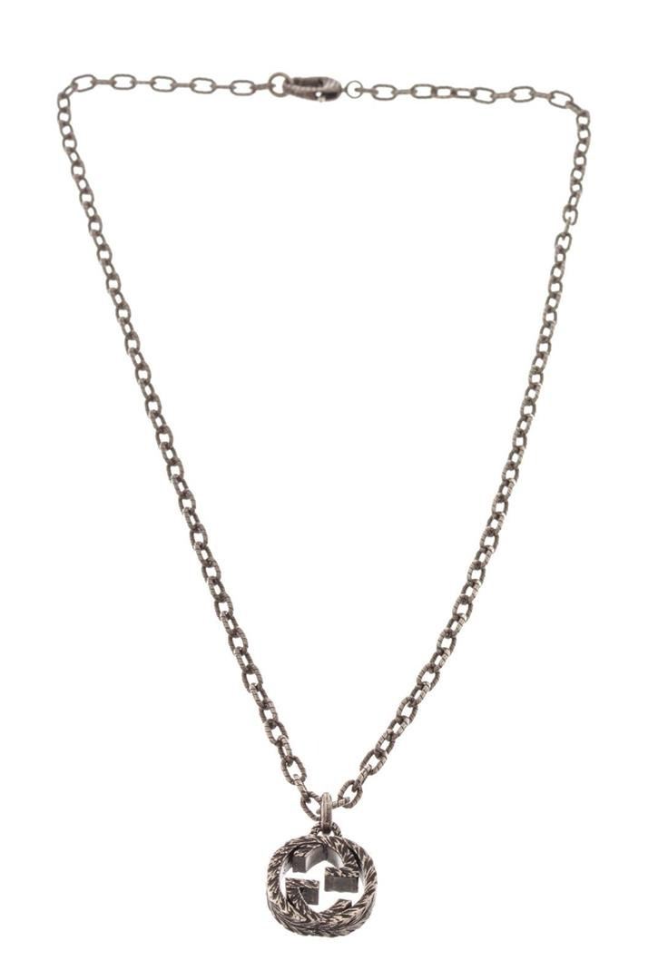 Gucci Silver-tone Interlocking GG Necklace features a silver-tone hardware, interlocking GG pendant, and a lobster claw closure.