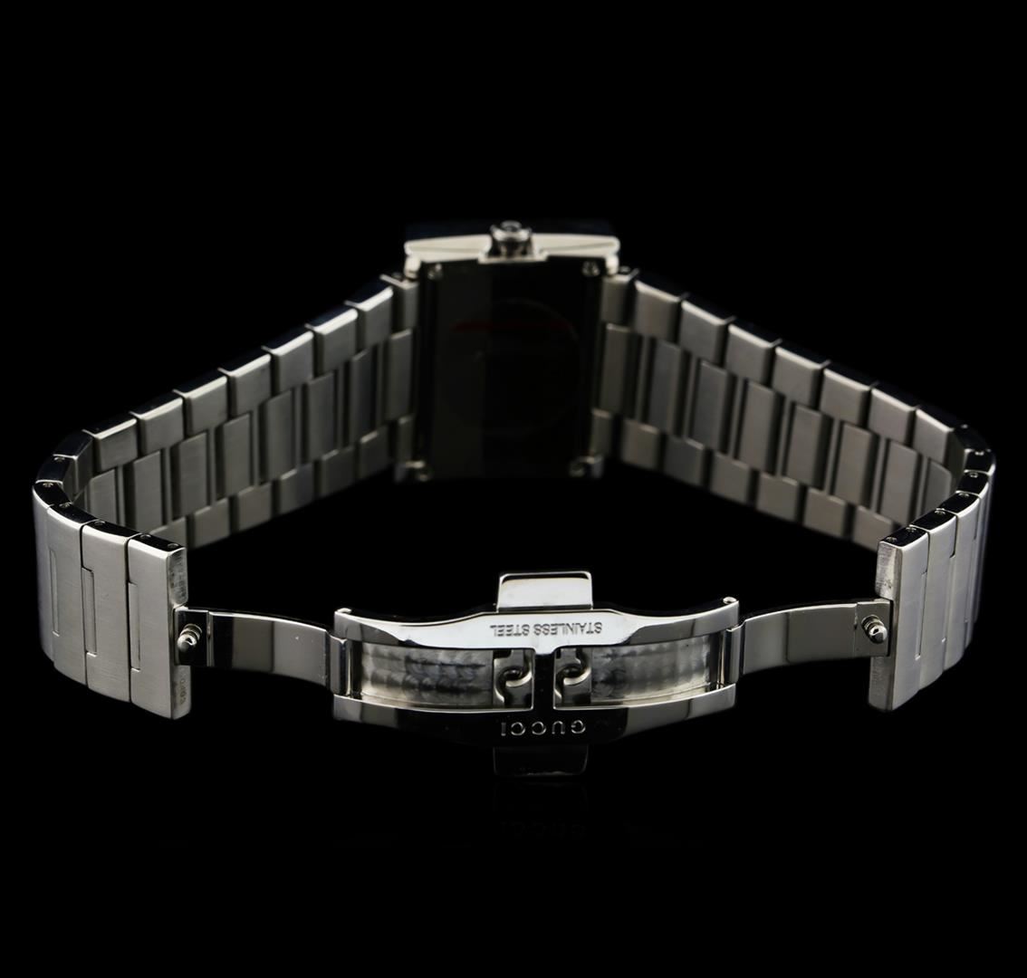 One Gucci 100L ladies watch. Movement: Quartz. Model: 100L. Functions: Hours and minutes. Case: Stainless steel. Crystal: Sapphire crystal. Bezel: Diamond set stainless steel. Dial Color: Mother of pearl. Bracelet: Stainless steel.