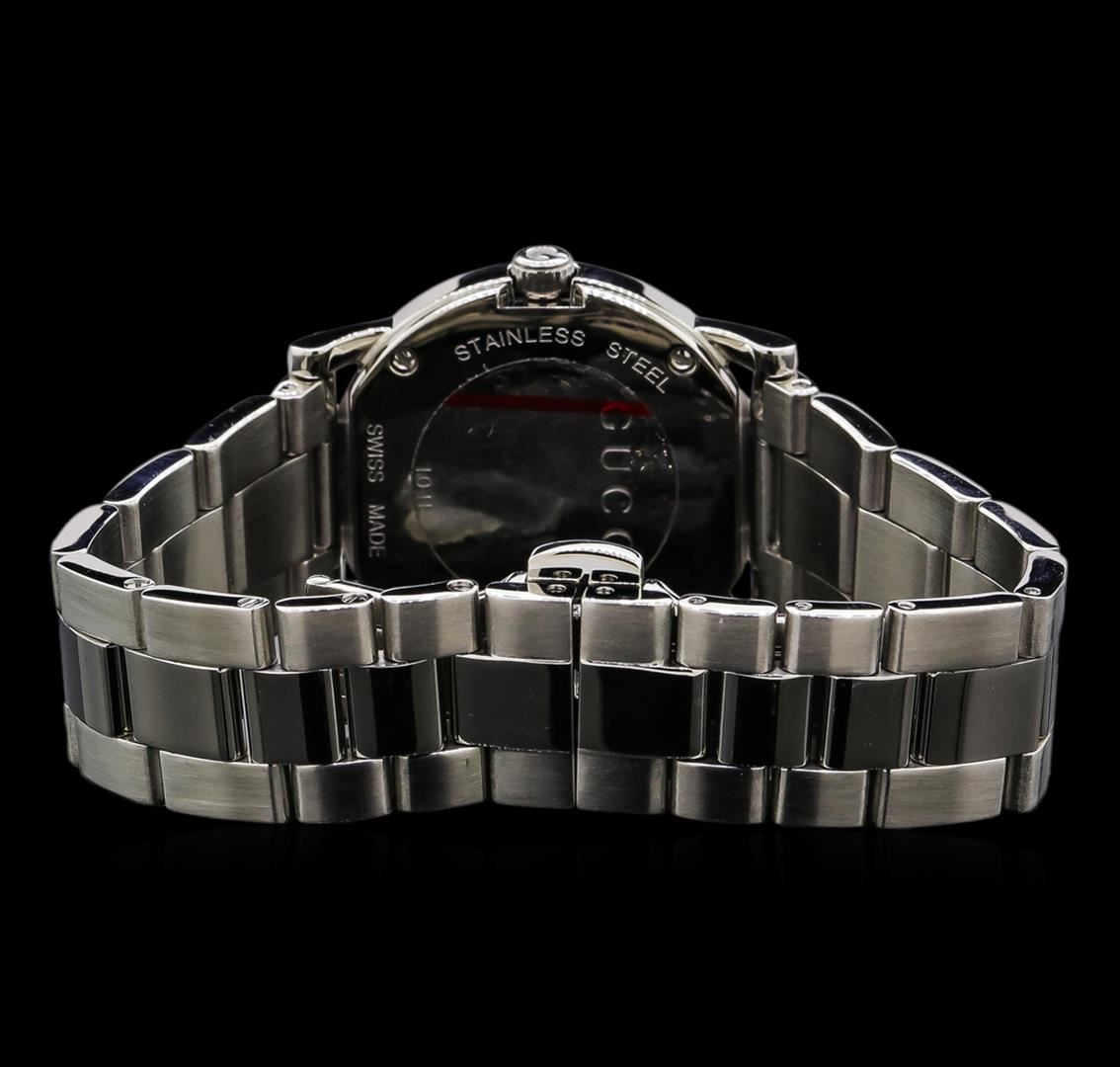 One Gucci G Factory ladies watch featuring: Case: stainless steel. Bezel: stainless steel set with diamonds. Dial: Mother of pearl; silver tone index hour markers ; silver tone hour and minute hands. Bracelet: Stainless steel. Condition: Good.