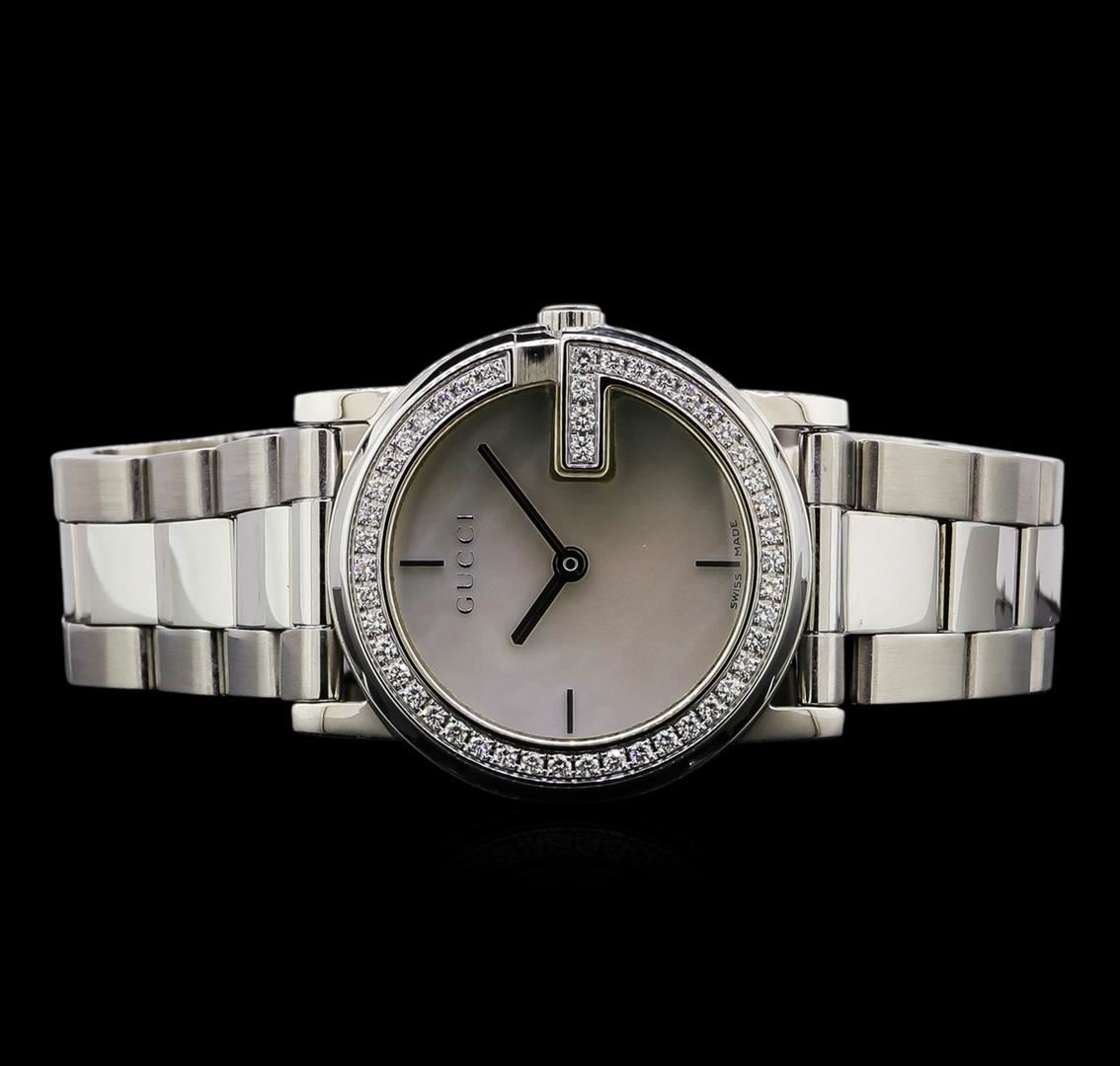 One Gucci G Factory ladies watch featuring: Case: stainless steel. Bezel: stainless steel set with diamonds. Dial: Mother of pearl; silver tone index hour markers ; silver tone hour and minute hands. Bracelet: Stainless steel. Condition: Good.