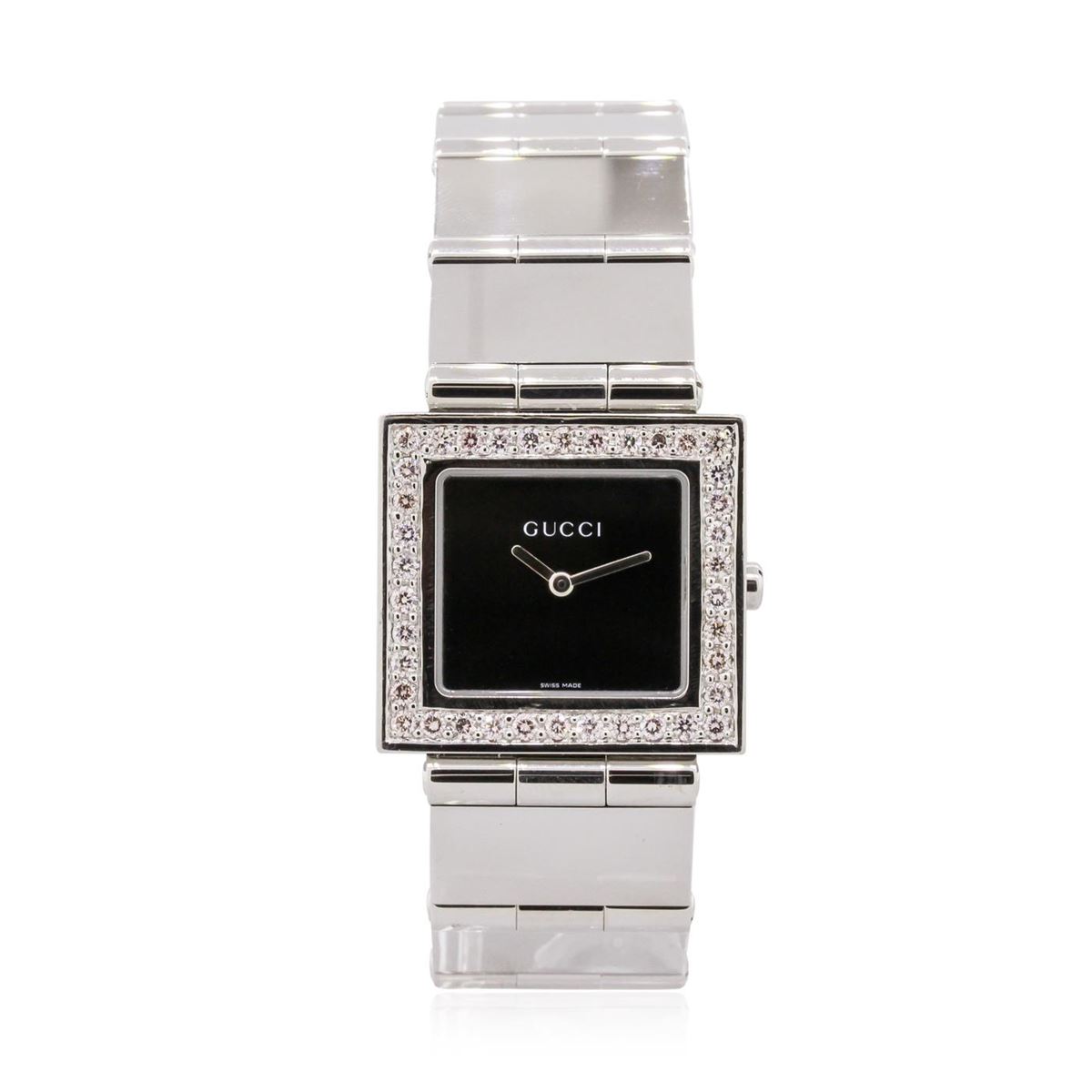 One unisex Gucci 600m Casual Style Wristwatch featuring: Square Factory Diamond Stainless Steel Bezel, Stainless Steel 30mm Case, Bracelet, Lugs, and Pull/Push Crown, Black Dial Analog Display with Hour and Minute Hands, Gucci marking at 12 o'clock position, no numbers, deployment clasp, Quartz Battery Movement, Sapphire Crystal, Screw-in (4 screw) Case Back, Water Resistant to 30m/99ft.