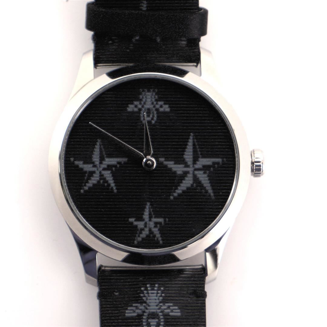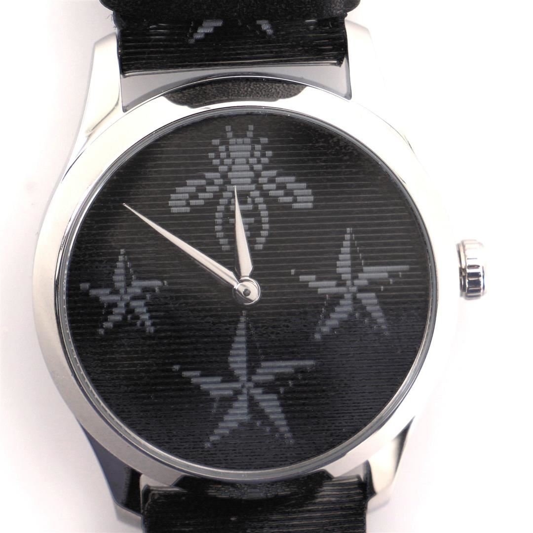 One Gucci Timeless Bee Star Hologram Quartz Watch Stainless Steel & Leather 38 Black. Item is sold AS-IS. All available information is listed in the description and shown in the photo. Gucci G-Timeless Bee Star Hologram Quartz Watch Stainless Steel and Leather 38 SS Quartz Black Leather Condition Details: Minimal wear on back of strap. Case Size/Width: 38mm,Watch Height: 10mm,Band Width: 19mm,Wrist circumference: 7.0"
