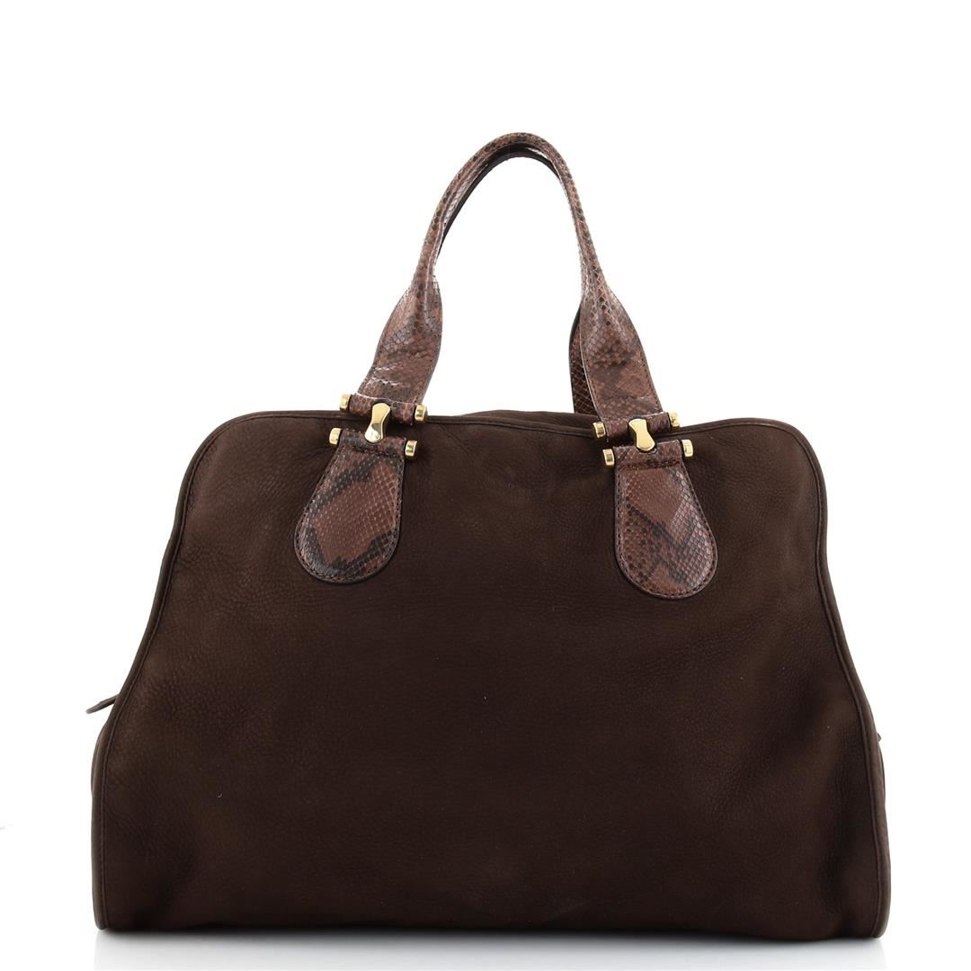 One Gucci Twice Satchel Nubuck with Python. Item is sold AS-IS. Please check photos and descriptions for all available details. Gucci Twice Satchel Nubuck with Python. Additional holes on side tabs. Odor in interior. Creasing and wear on exterior, moderate wear on exterior edges, slight peeling and lifting of scales on handles. Bubbling on handle bases, splitting on zipper pull wax edges, scratches on hardware.