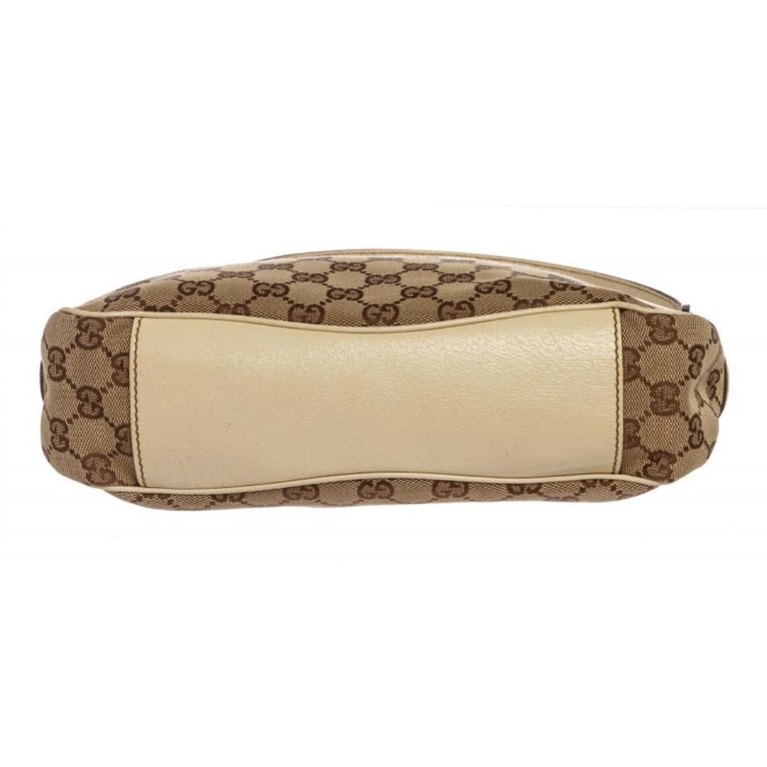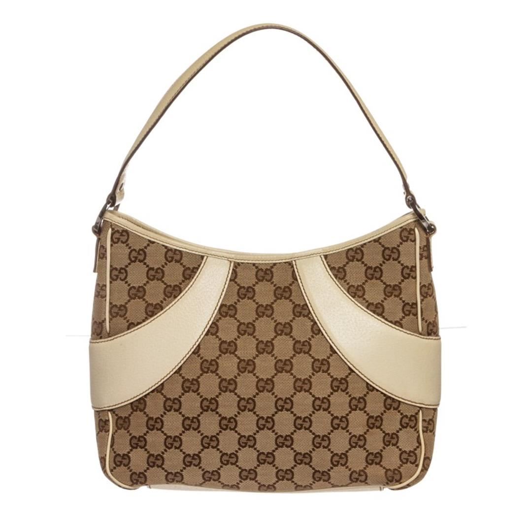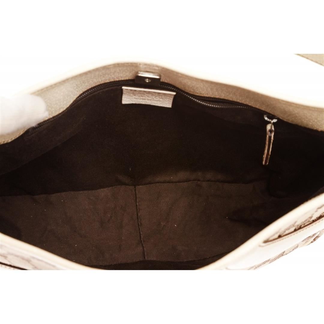 One Gucci White Brown Canvas Leather Monogram Shoulder Bag. White leather trim brown and tan canvas monogram shoulder bag contains fabric lining with one interior side zipper pocket.