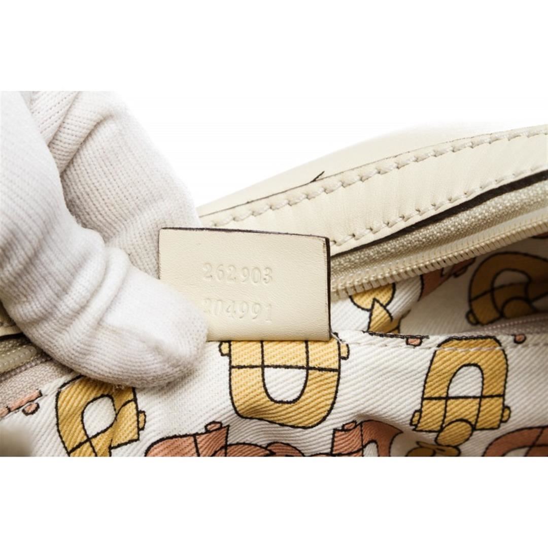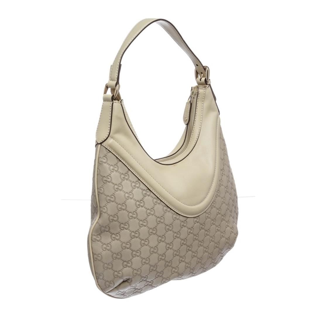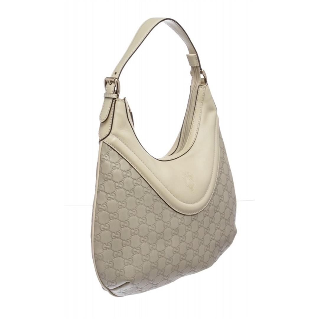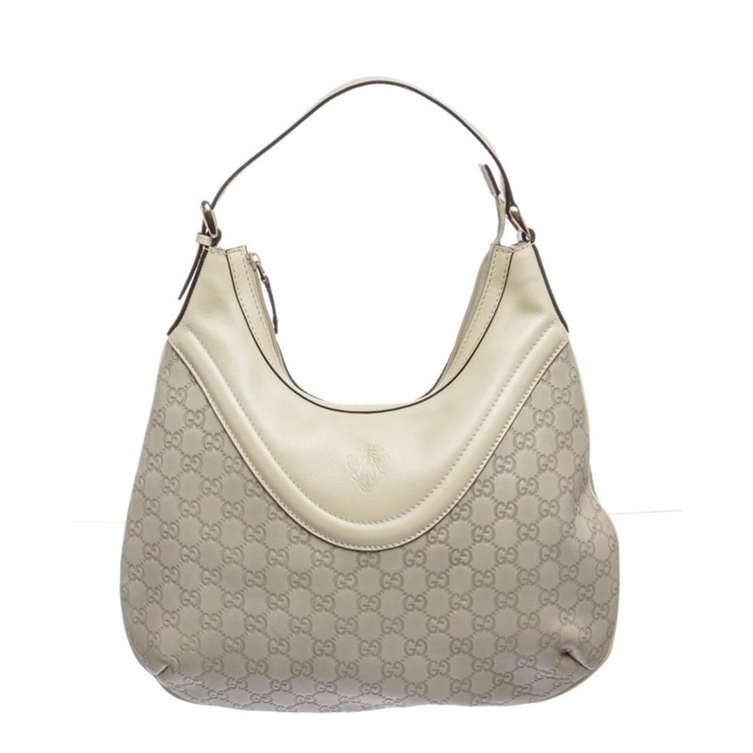 One Gucci White Guccissima Leather Hysteria Crest Hobo Bag. Ivory Guccissima Leather with embossed Gucci crest. Interior is fabric lined with two pockets at interior wall; one with zip closure. Single flat leather adjustable shoulder strap.