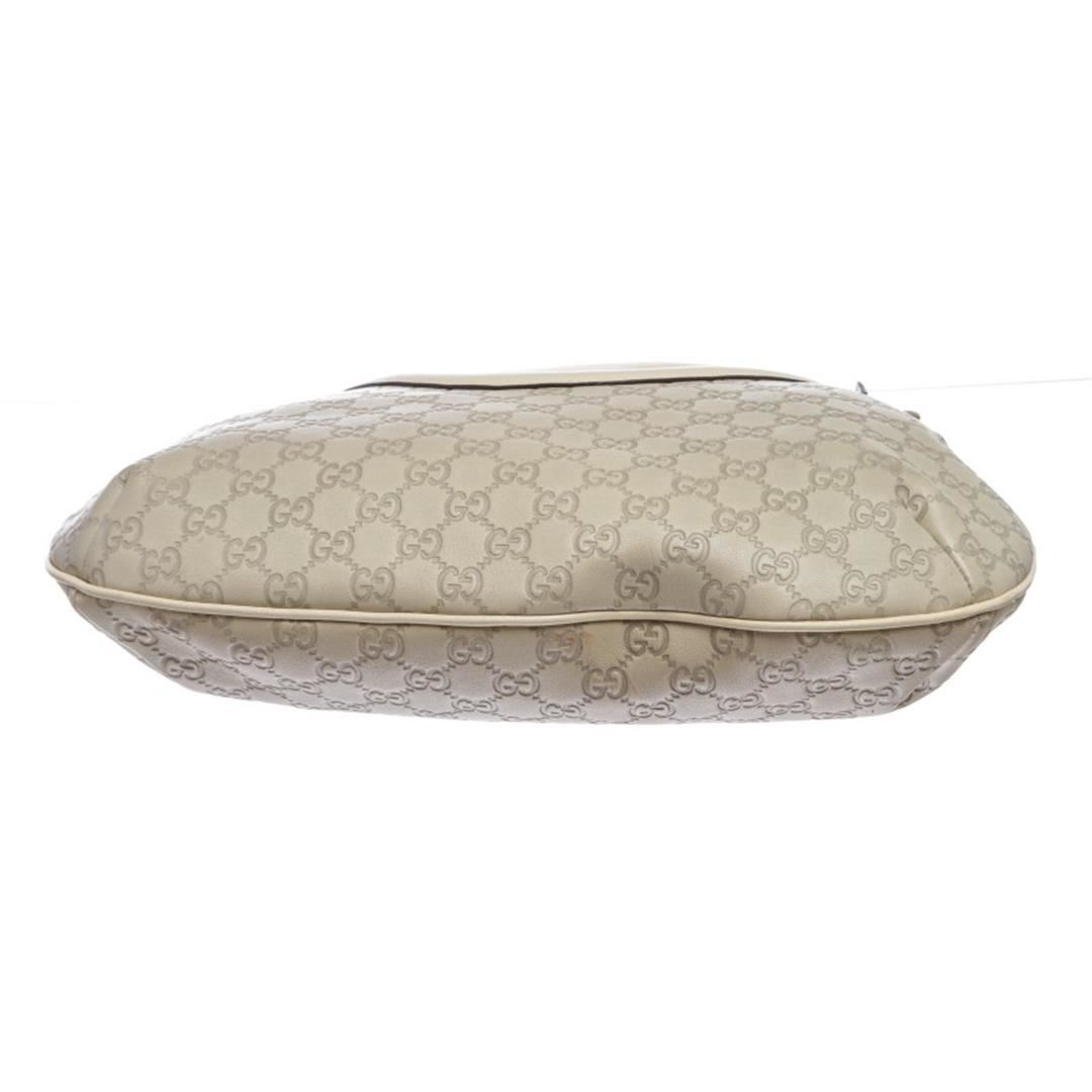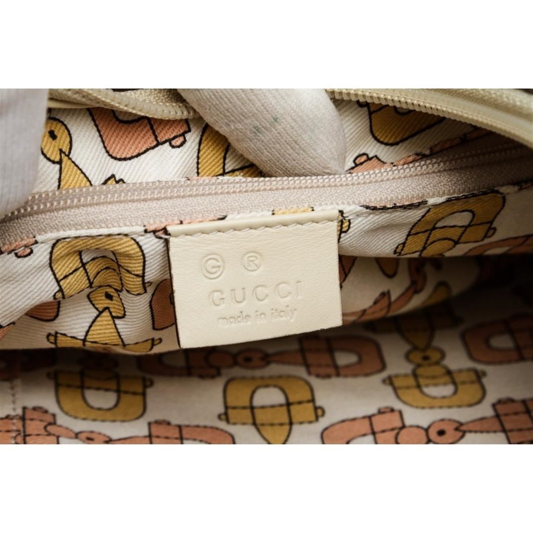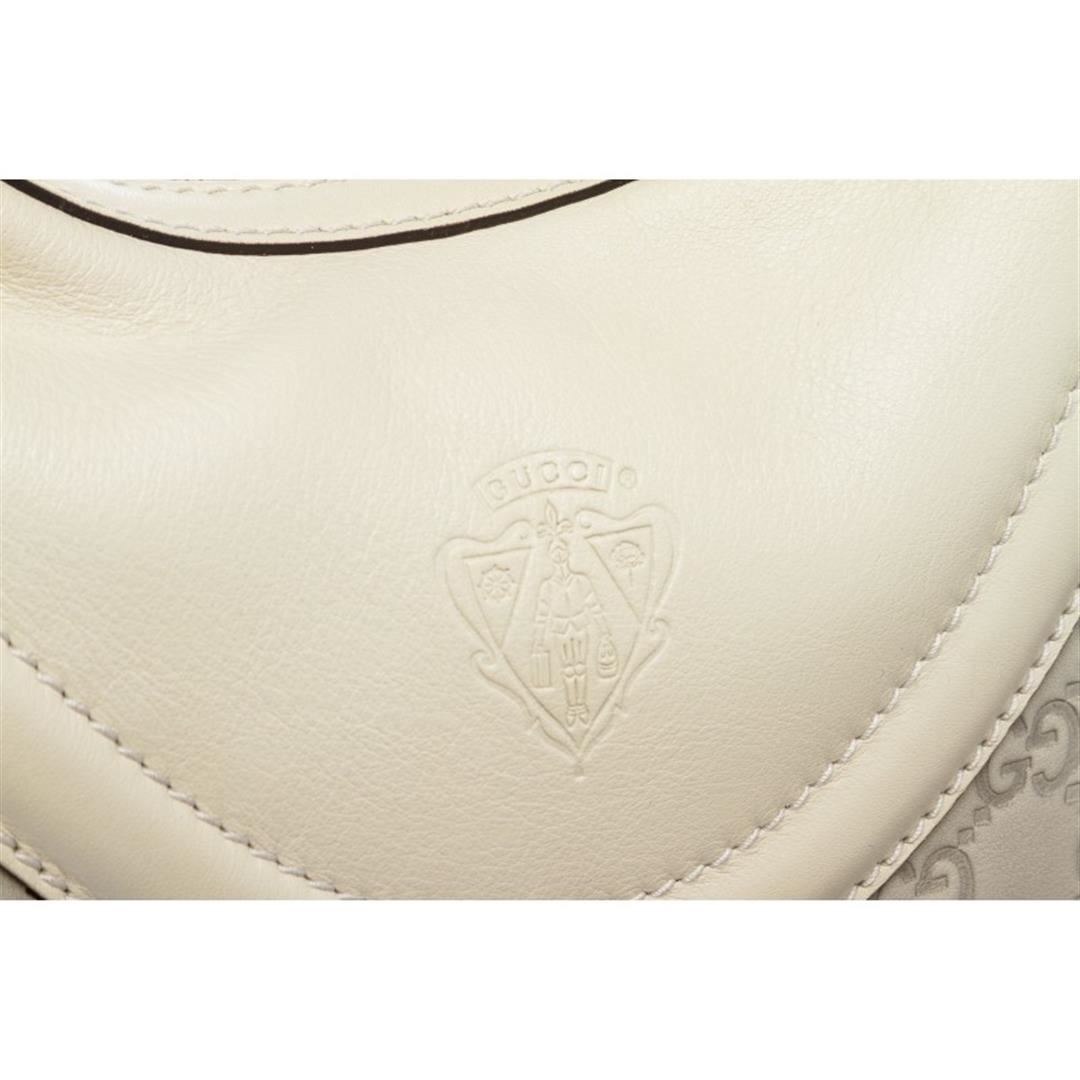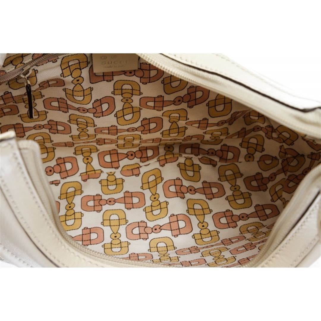 One Gucci White Guccissima Leather Hysteria Crest Hobo Bag. Ivory Guccissima Leather with embossed Gucci crest. Interior is fabric lined with two pockets at interior wall; one with zip closure. Single flat leather adjustable shoulder strap.