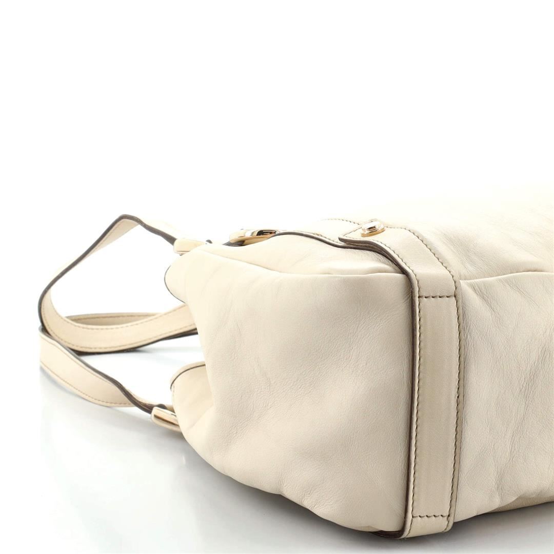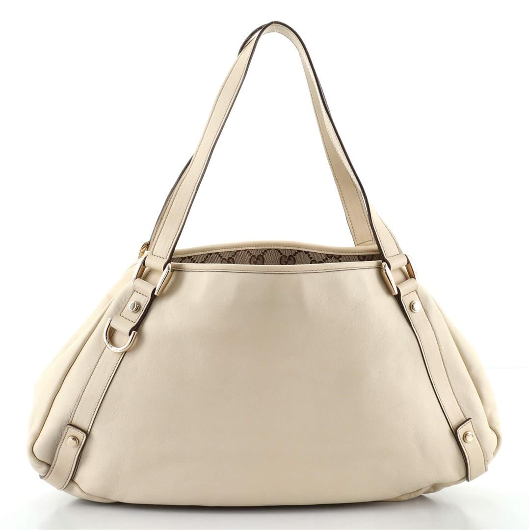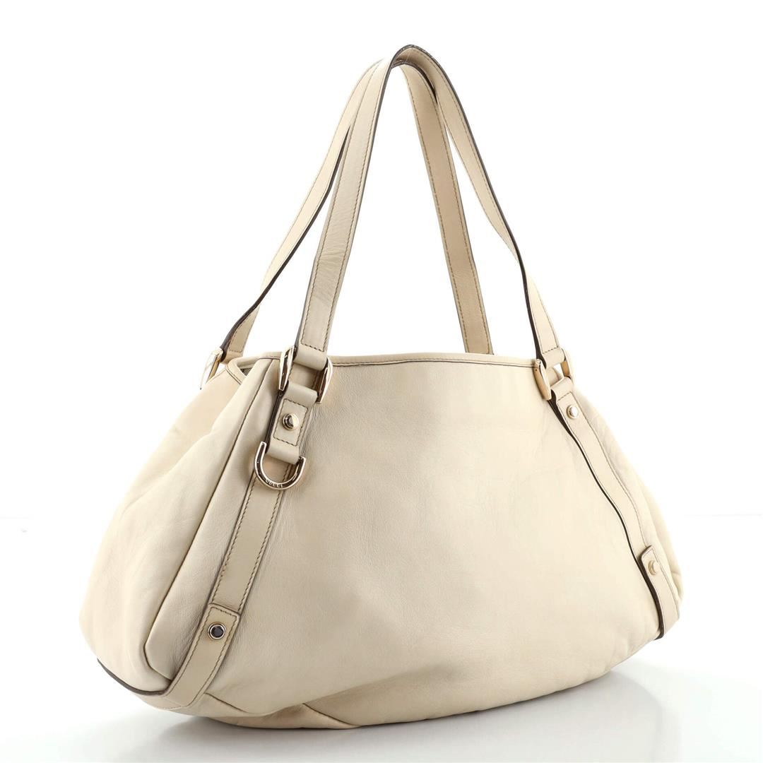 Gucci White Leather Abbey Medium Shoulder Bag Condition Details: Creasing, scuffs and minor discoloration on exterior, splitting and cracking on handle and base corner wax edges. Small glue stain on side opening trim, scratches on hardware. Measurem