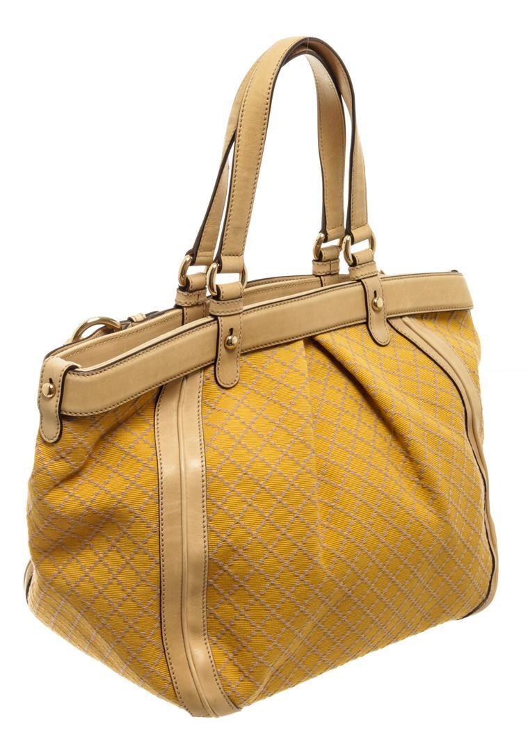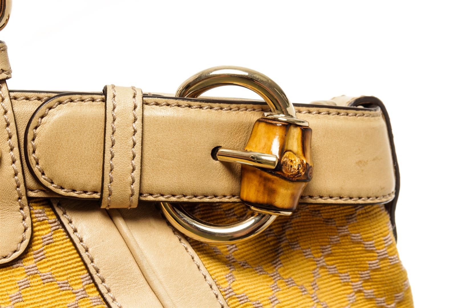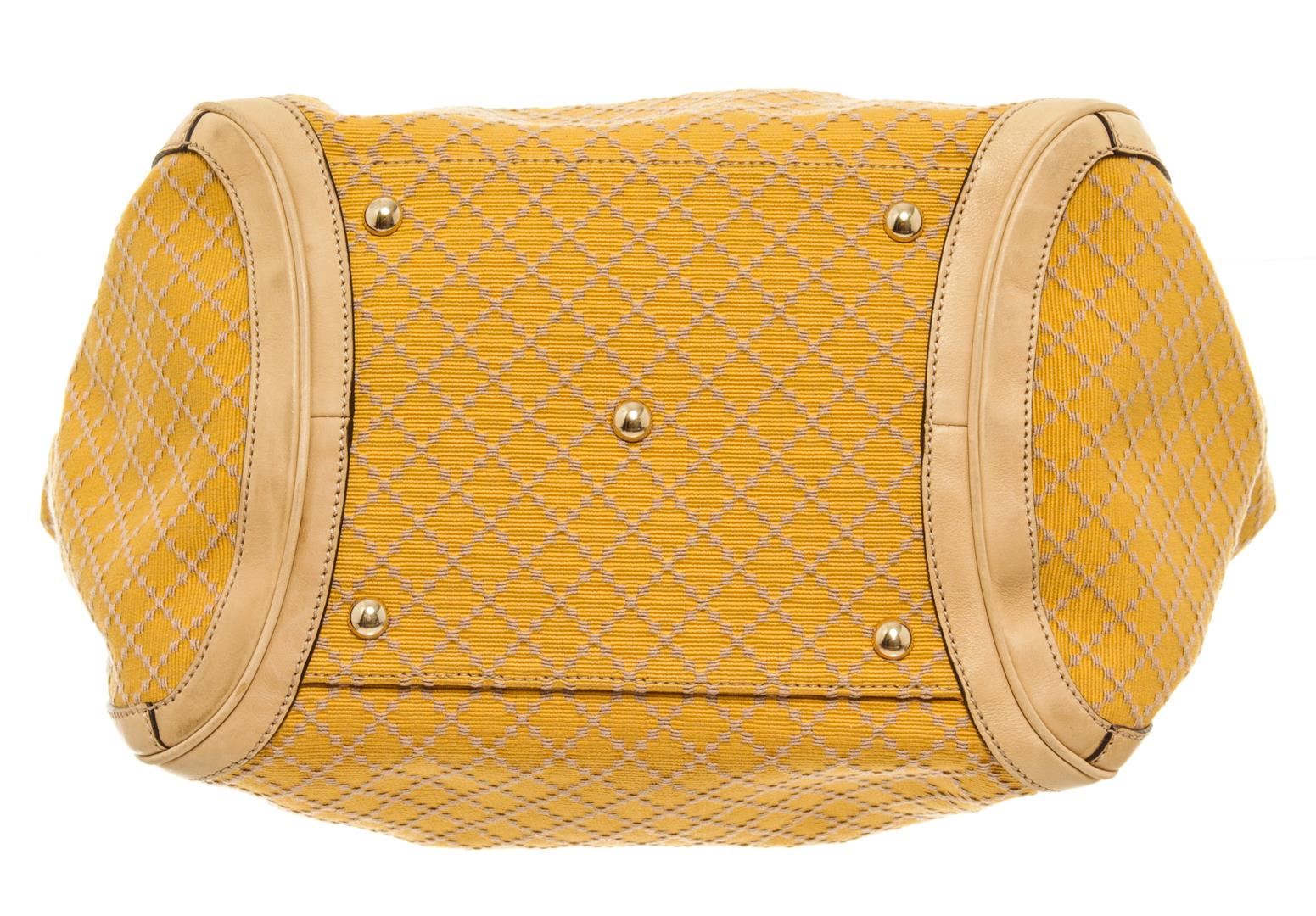 One Gucci Yellow Bambus Gelb Diamante Handbag. Item is sold AS-IS. All available information is listed in the description and shown in the photo. Gucci Yellow Bambus Gelb Diamante Handbag 9.84"h x 11.02"w x 7.87"d / height : ~ 25 cm width : ~ 28 cm -40 cm depth : ~ 20 cm handle : ~ 17.5 cm