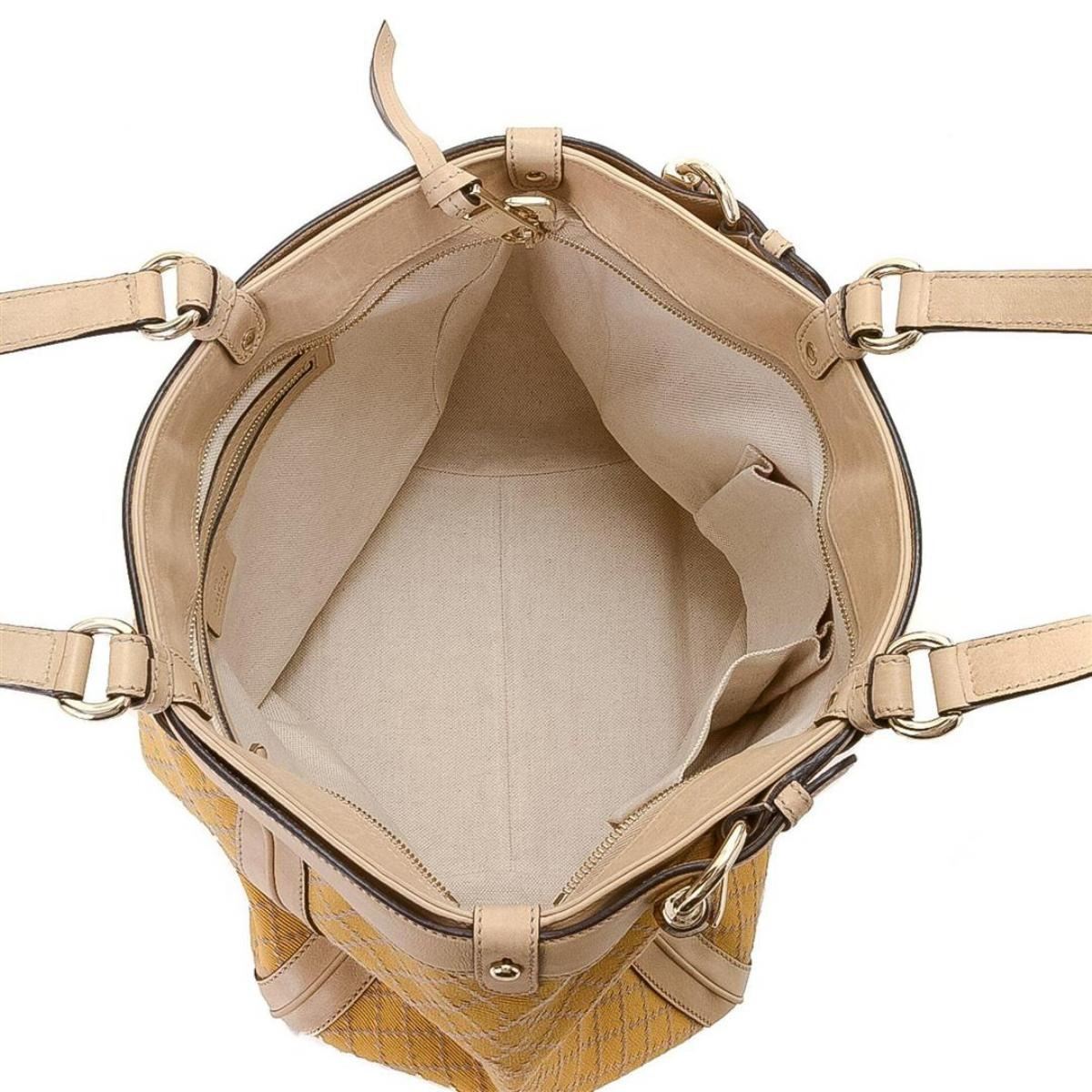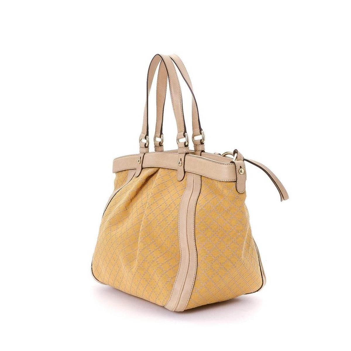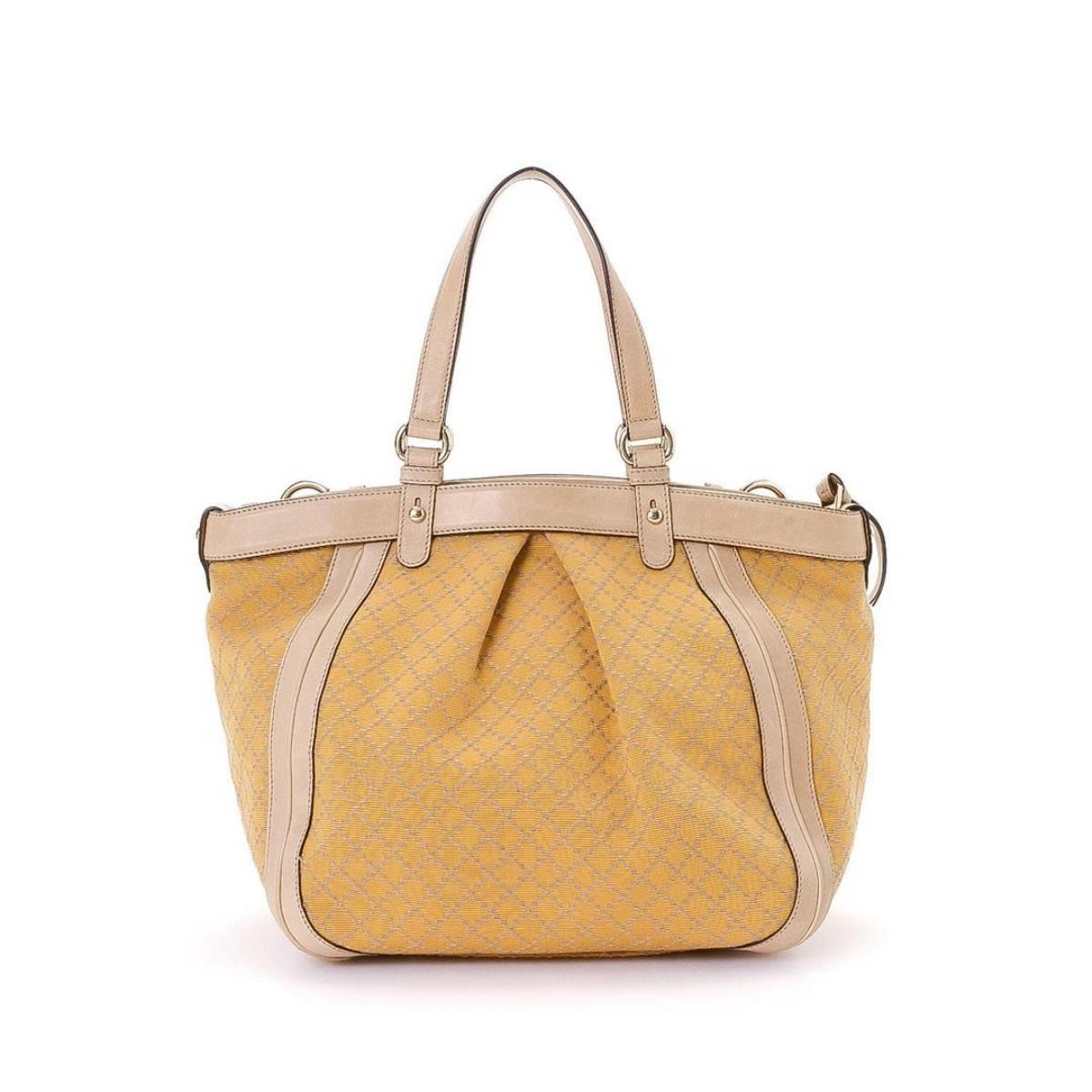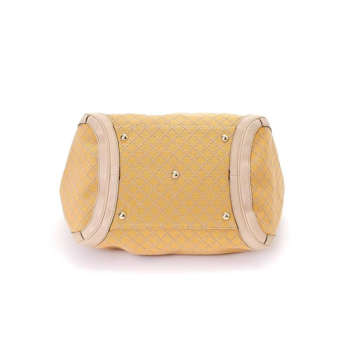 Gucci Yellow Canvas Diamante Tote Bag with gold-tone hardware, dual rolled top handles, leather trim, pleated at top, natural canvas lining, single interior zip pocket and magnetic snap closure at top. Measurements: Length: 4.5 in / 11 cm Width: 14 in / 36 cm 10 in / 25 cm Condition: Pre-Owned Good overall, please see photographs for detail.