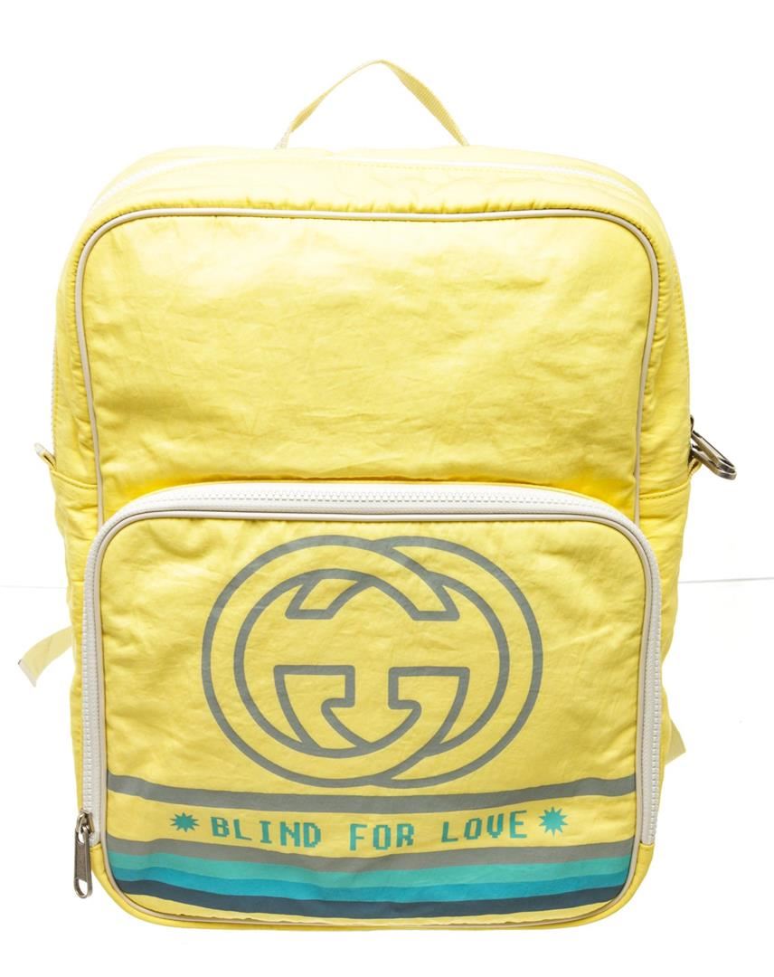 Gucci Yellow Nylon Canvas 80 Patch Backpack Bag with nylon canvas, gold-tone hardware, trim leather, exterior zip pocket, interior zip pocket, shoulder strap and zipper closure.