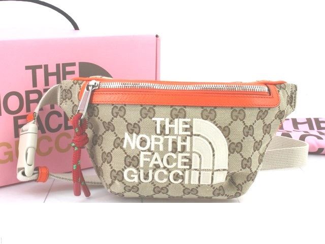 One Gucci x North Face Beige/Ebony GG Canvas Leather Belt Bag. Item is sold AS-IS. All available information is listed in the description and shown in the photo. GG Beige Canvas Orange Leather