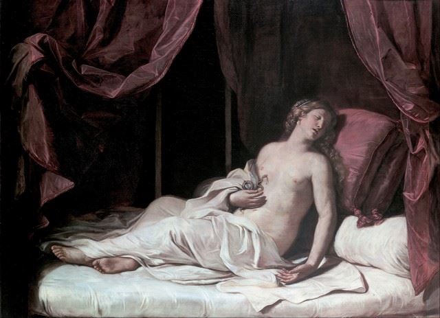 Artist: Guercino - Title: Death of Cleopatra - Medium: Fine Art Reproduction Giclee on Canvas - Image Size: Approximately 23 inches x 32 inches - Unframed on Unstretched Canvas - Biography: Giovanni Francesco Barbieri, better known as Guercino, or il Guercino, was an Italian Baroque painter and draftsman from Cento in the Emilia region, who was active in Rome and Bologna. The vigorous naturalism of his early manner contrasts with the classical equilibrium of his later works. His many drawings are noted for their luminosity and lively style.