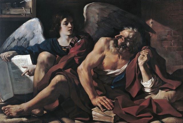 Artist: Guercino - Title: Saint Matthew and the Angel - Medium: Fine Art Reproduction Giclee on Canvas - Image Size: Approximately 21.25 inches x 32 inches - Unframed on Unstretched Canvas - Biography: Giovanni Francesco Barbieri, better known as Guercino, or il Guercino, was an Italian Baroque painter and draftsman from Cento in the Emilia region, who was active in Rome and Bologna. The vigorous naturalism of his early manner contrasts with the classical equilibrium of his later works. His many drawings are noted for their luminosity and lively style.