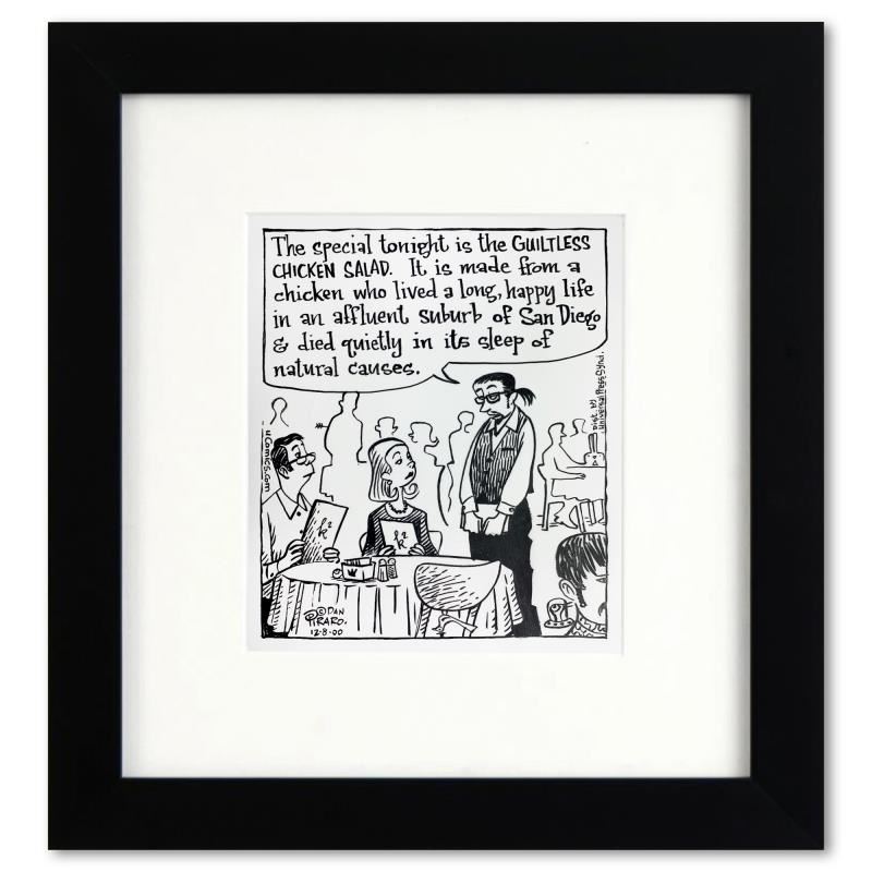 Enter a surreal and satirical world of twisted imagination and award winning creativity. Guiltless Chicken Salad is an original pen & ink drawing on paper by Dan Piraro, creator of the critically acclaimed and award winning comic strip, Bizarro. This piece is hand signed, comes custom framed and includes a letter of authenticity. Measures approximately 12 x 11 (frame), 7 x 6 (image).This item requires special handling and may have a longer than usual turnaround.