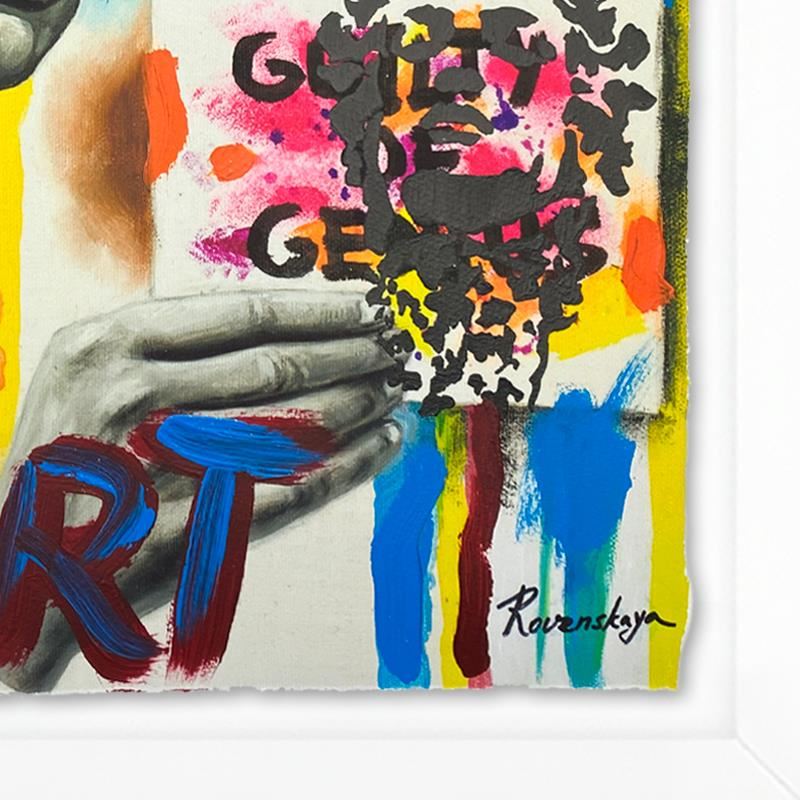 "Guilty of Genius" is a one-of-a-kind mixed media on deckle edge paper by Nastya Rovenskaya, Hand signed by the artist. This piece comes floating in a custom frame. Includes Letter of Authenticity. Measures approximately 24" x 21" (framed), 20" x 17" (image).