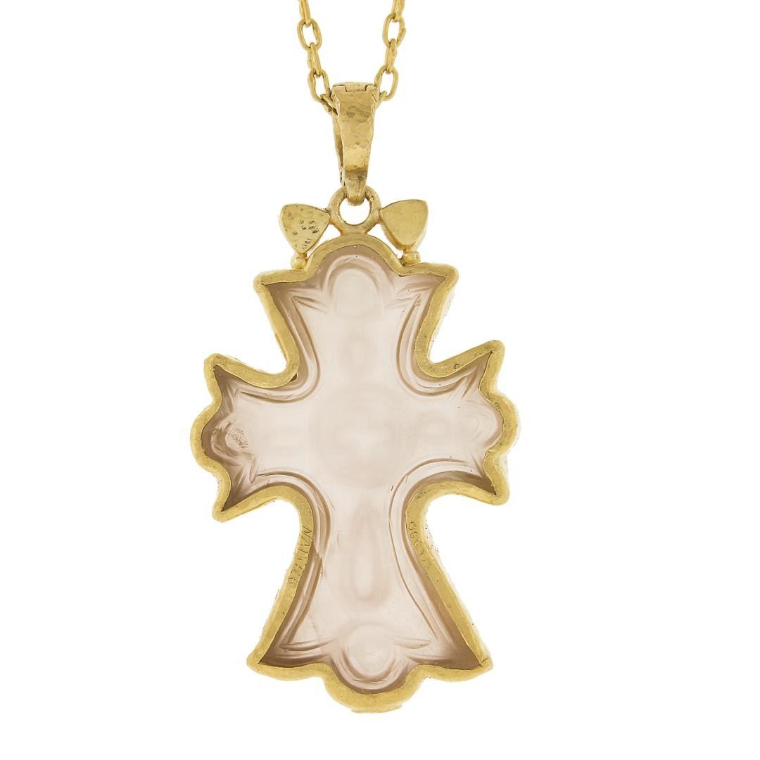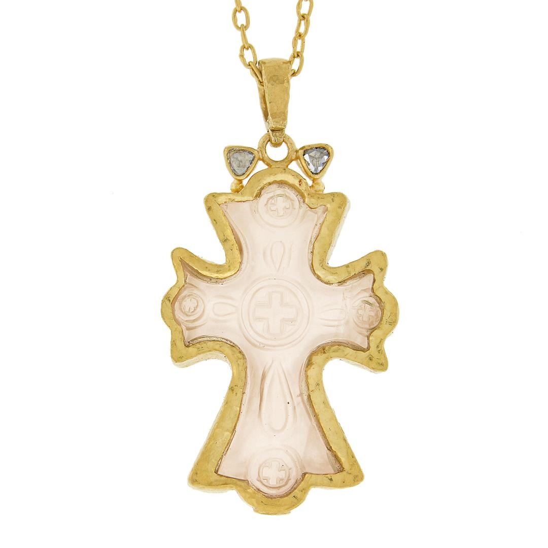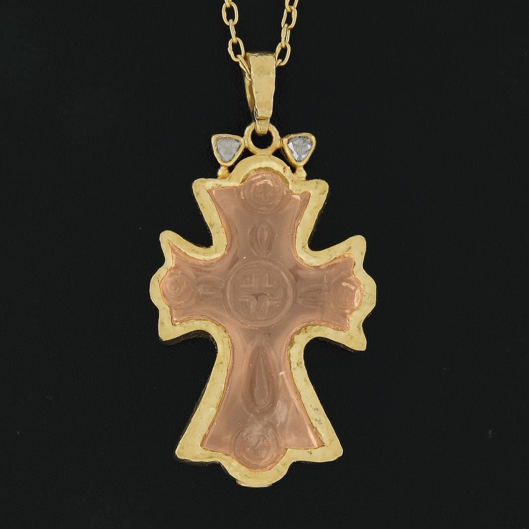 a solid 23k yellow gold cross pendant necklace by Gurhan, featuring 1 carved cross shape natural rose quartz, and 2 rose cut natural diamonds. Adjustable 16.25 or 18 inch cable link chain, 18.12 grams total weight, pendant measures 19.1x25.8mm.