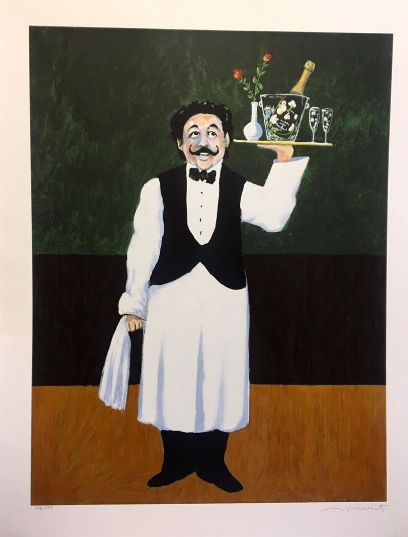 Guy Buffet "Room Service" . "Room Service" is a classic , architypal Guy Buffet French waiter; the kind of image that has made him famous in art, giftware, kitchen accessories and posters all over the world. This is a pencil signed limited edition serigraph on paper .