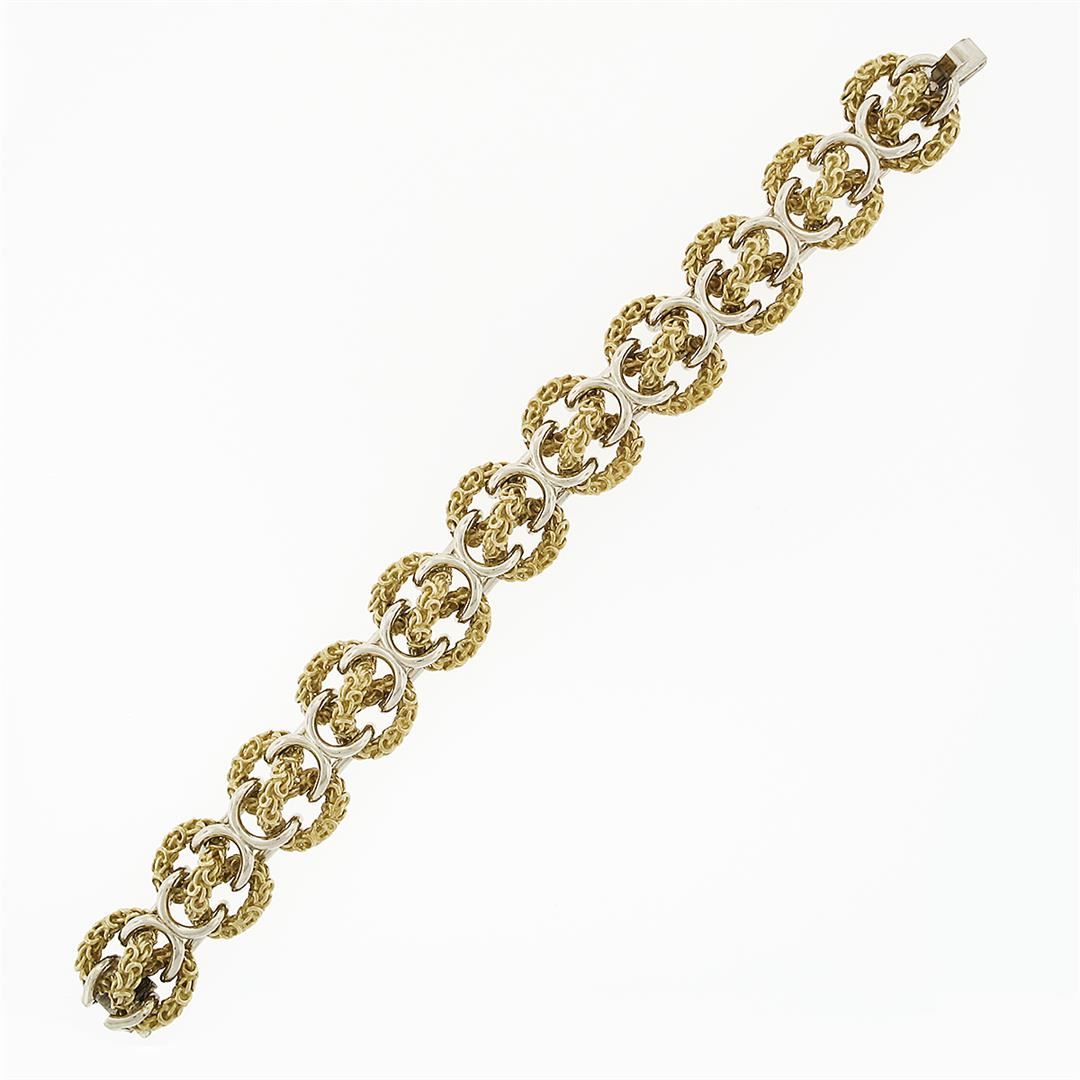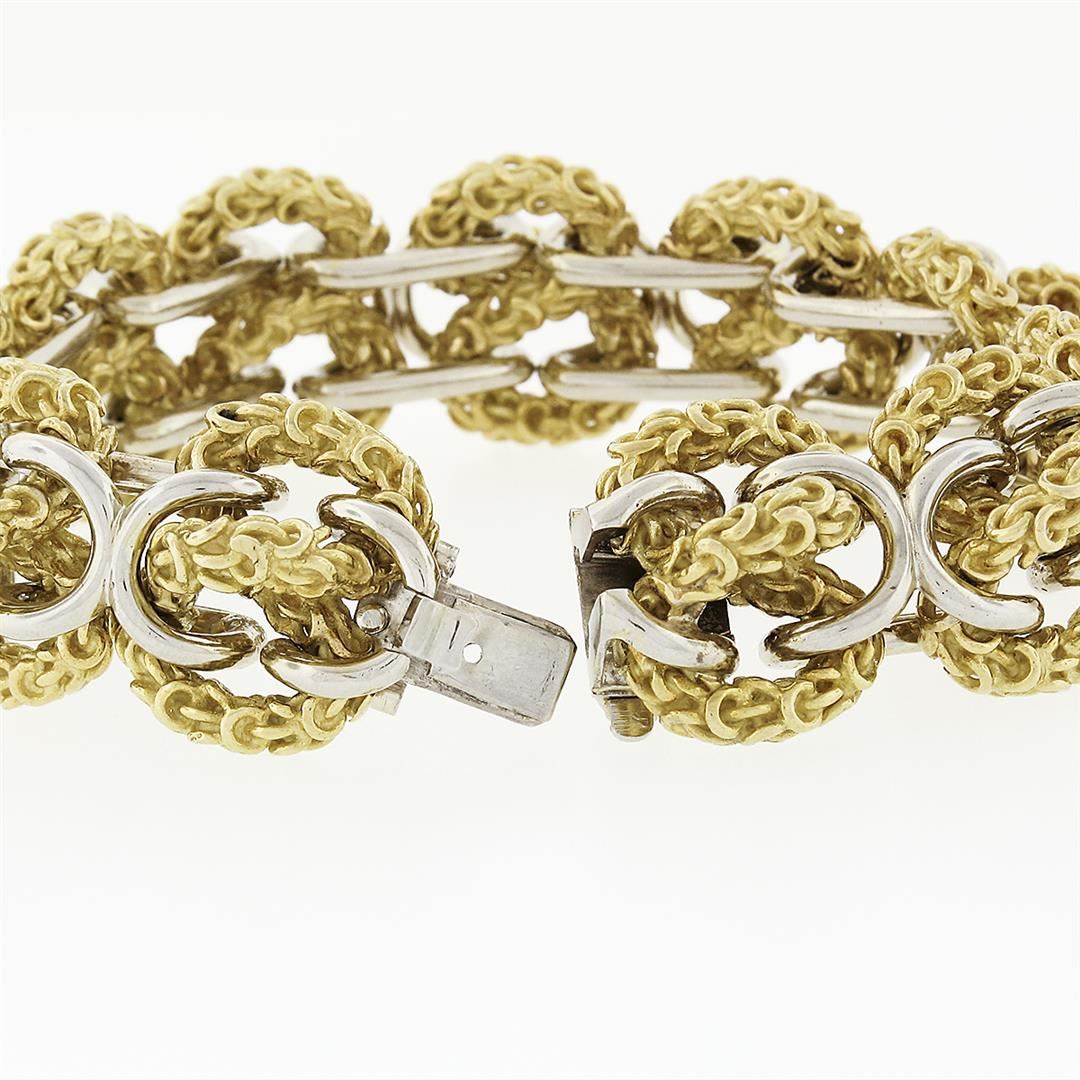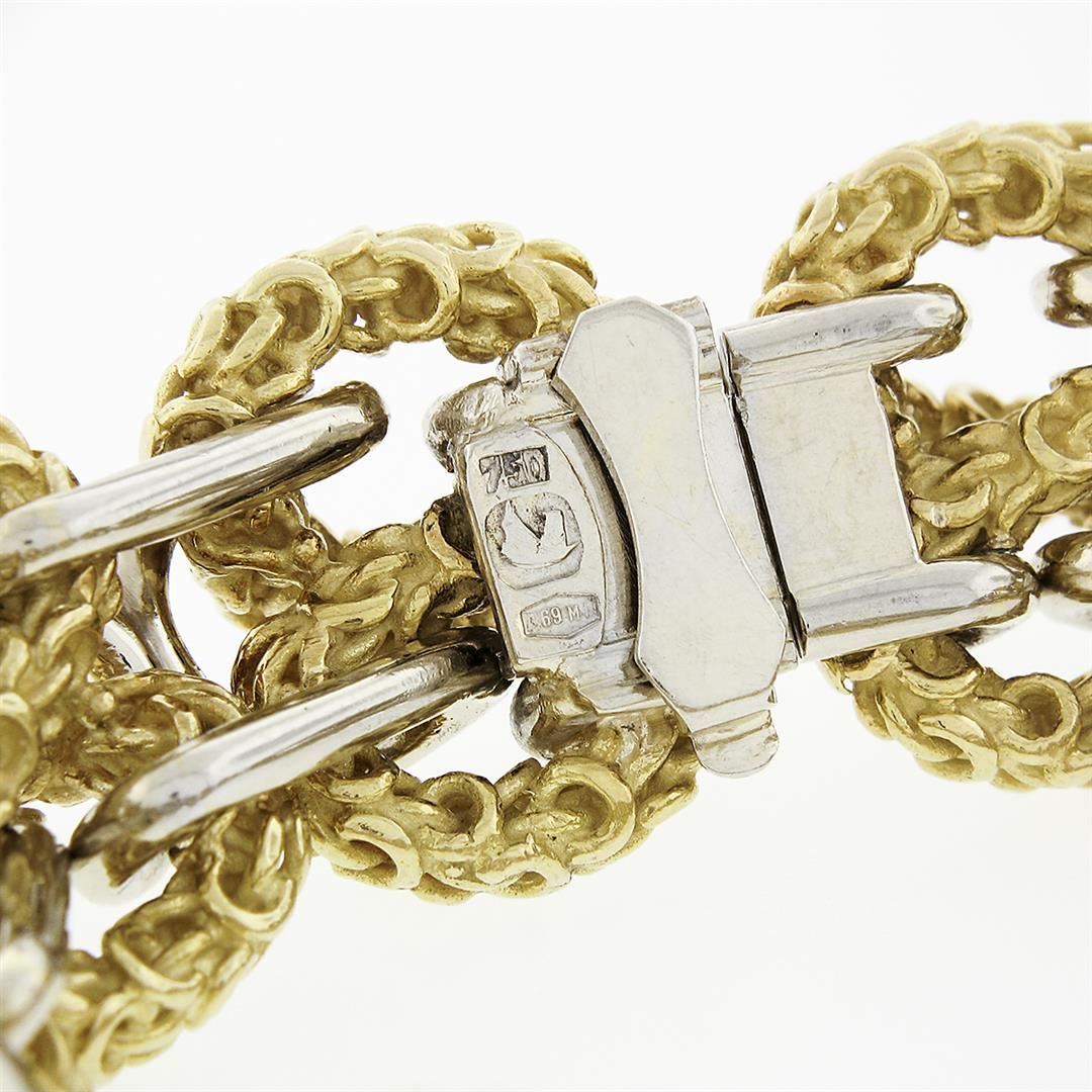 A solid 18k yellow & white gold wide infiity knot link bracelet. It weighs a total of 102.50 grams, measures 18.65mm wide, and measures 7 inches in length.
