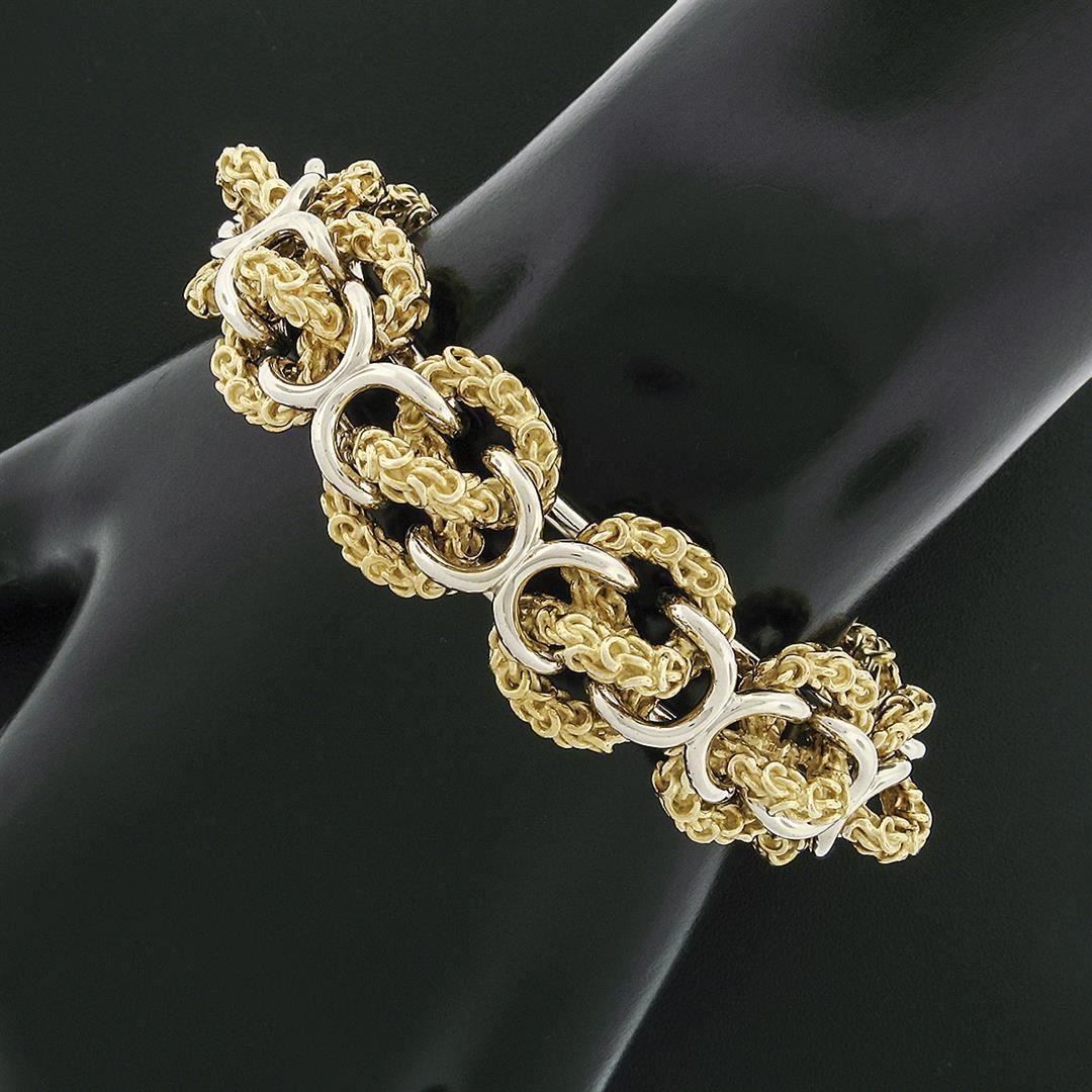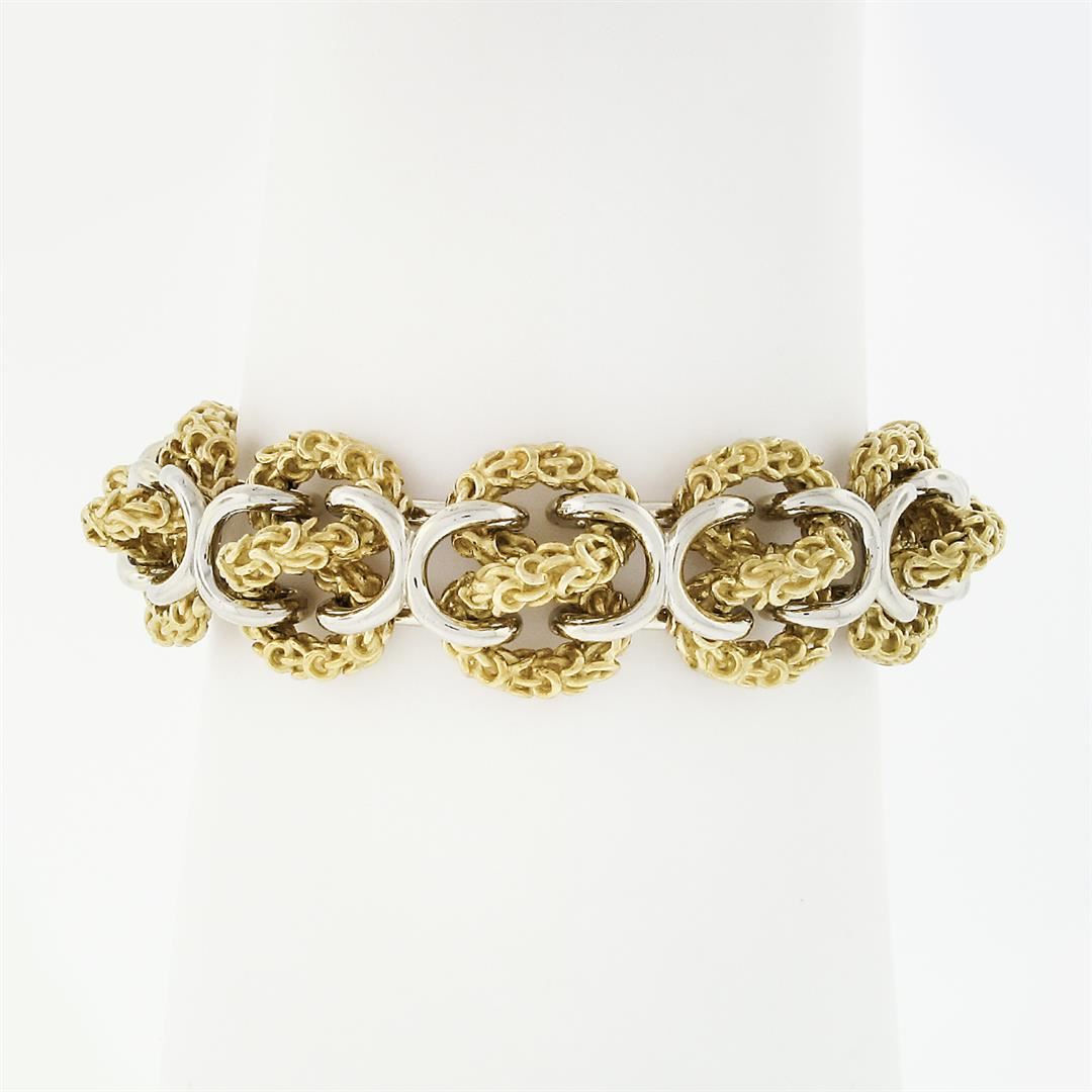 A solid 18k yellow & white gold wide infiity knot link bracelet. It weighs a total of 102.50 grams, measures 18.65mm wide, and measures 7 inches in length.