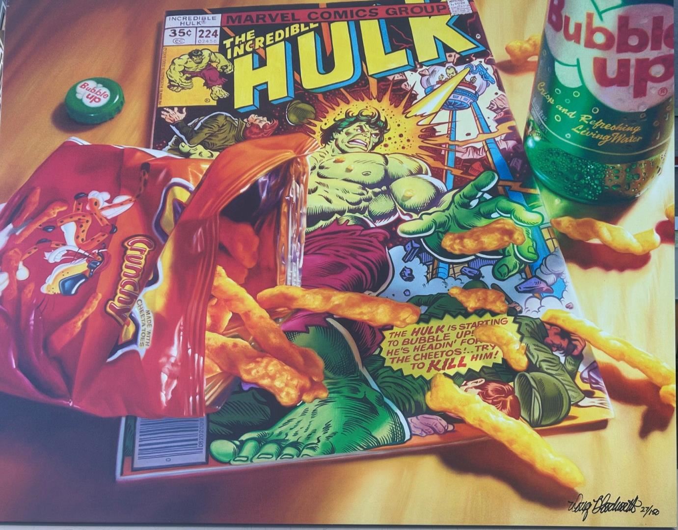 A hand-embellished giclee on stretched canvas 50x40, Doug Bloodworth tempts The Hulk with a bag of Cheetos . Signed & numbered 27/150